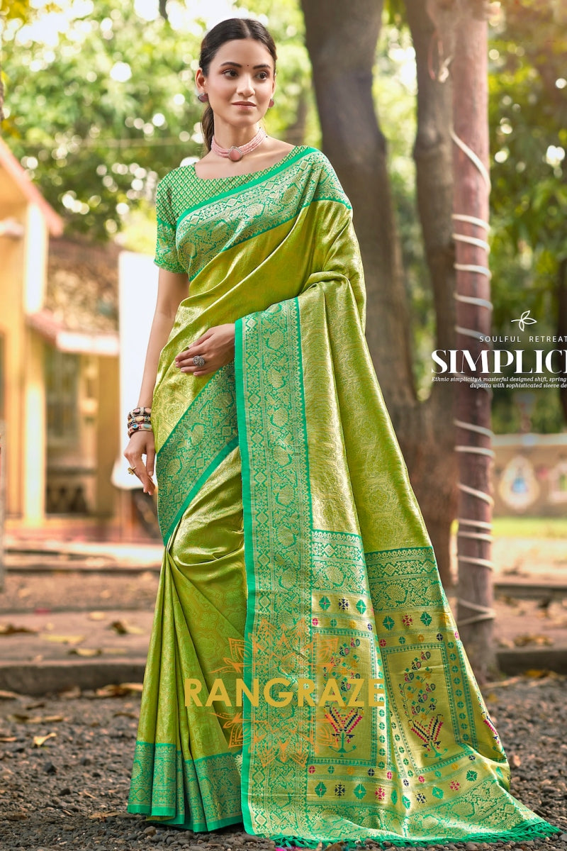 Introducing the "Emerald Green Zari Kanjivaram Silk Saree" from Rangraze – a striking fusion of...