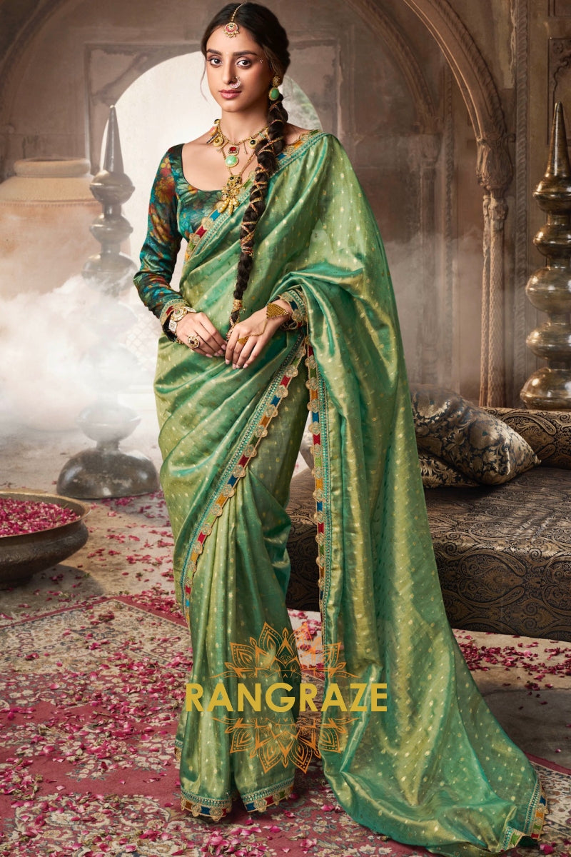 Emerald Green Glow Tissue Saree with Multicolor Lace and Designer Blouse