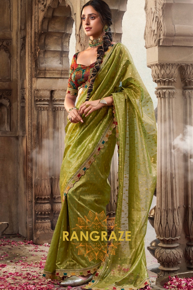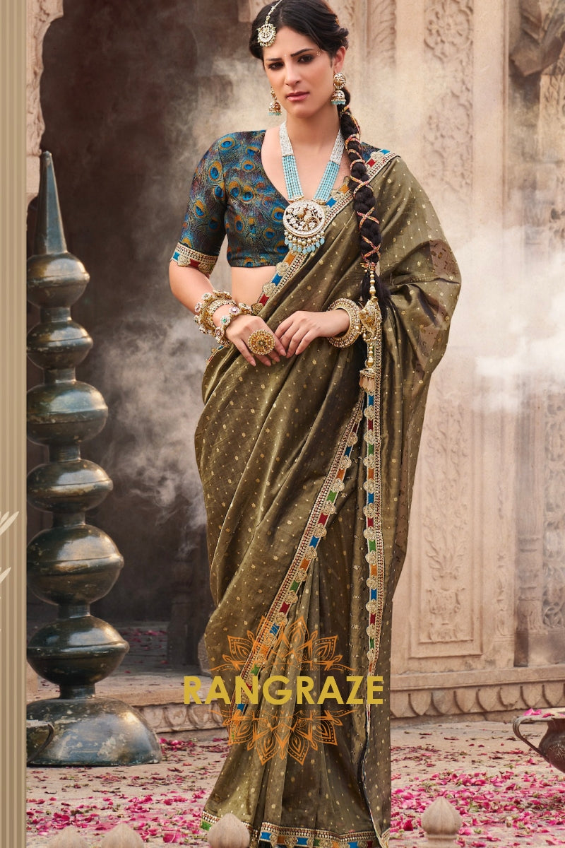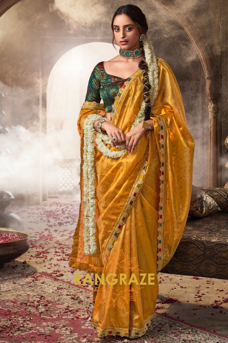 Olive Gold Tissue Saree with Multicolor Lace and Royal Embroidered Blouse