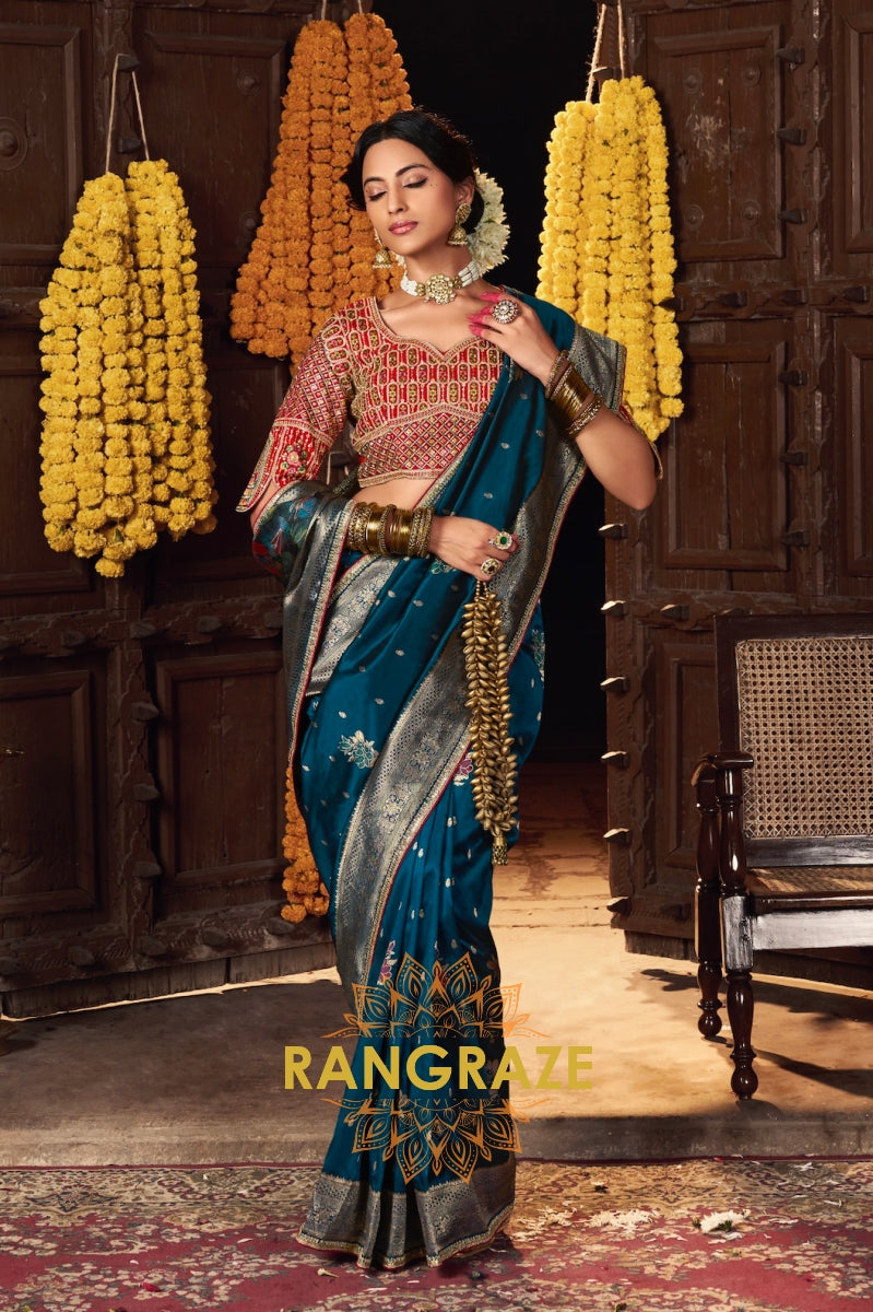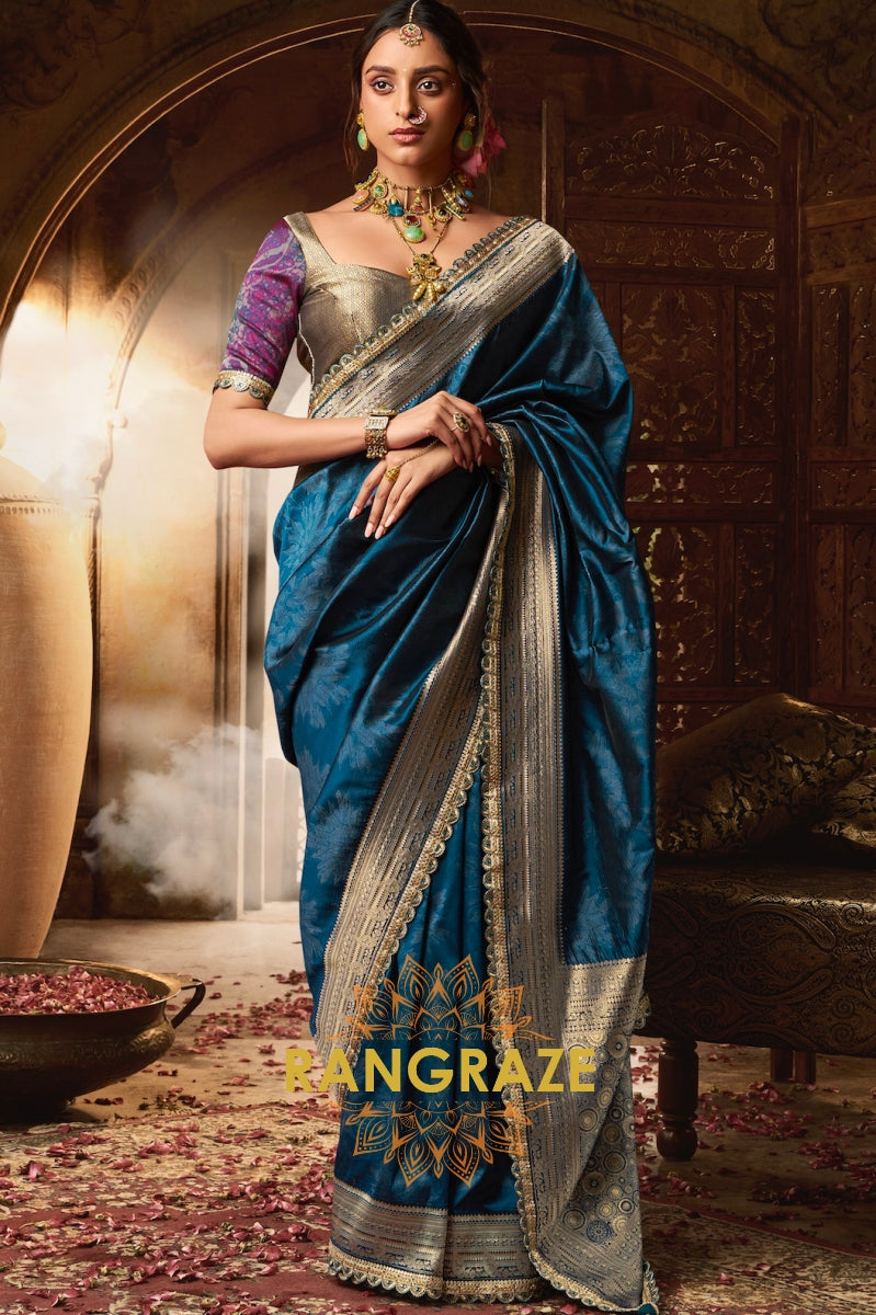 Sapphire Blue Banarasi Silk Saree with Opulent Zari Detailing and Designer Blouse
