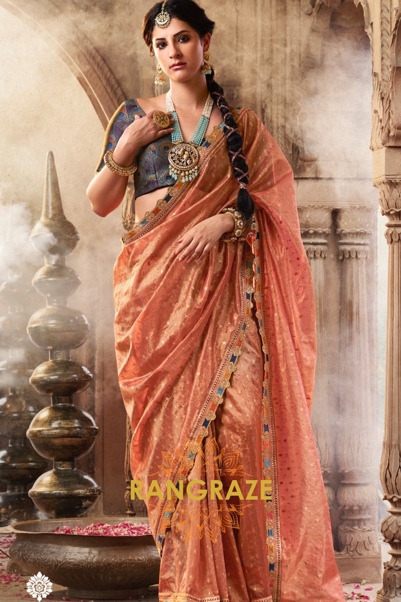 Peach Glow Tissue Saree with Intricate Lace and Designer Embroidered Blouse