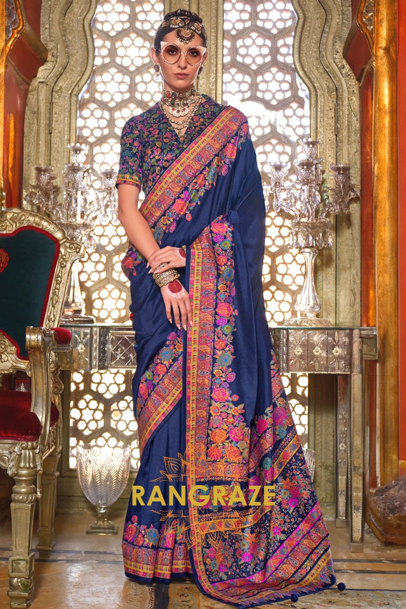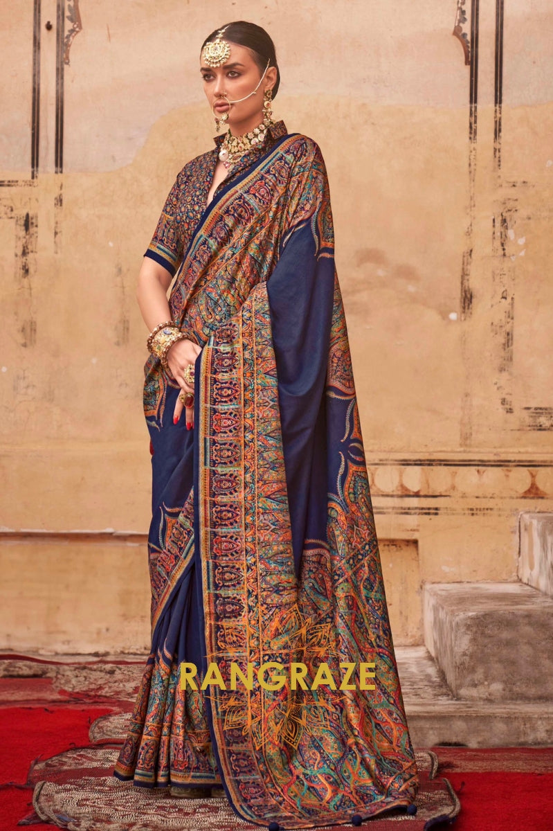 Navy Blue & Multicolor Printed Premium Silk Saree