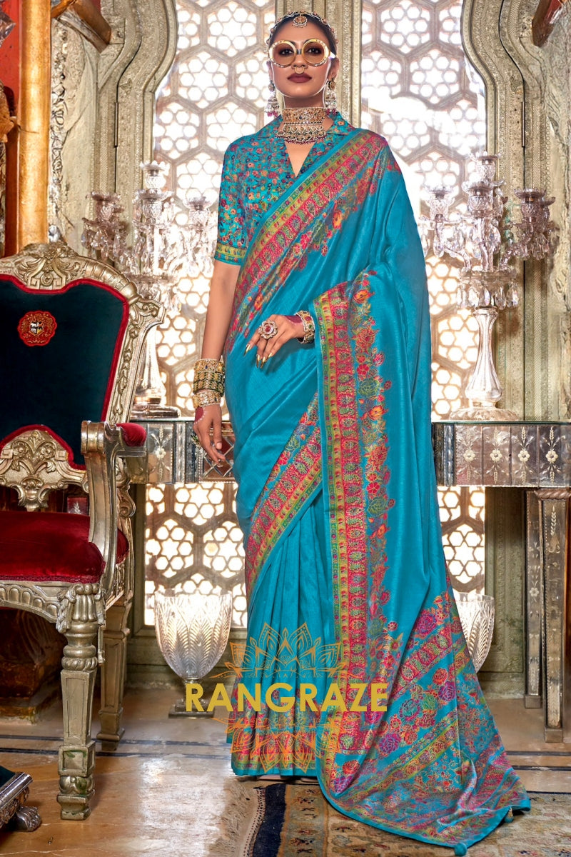 Classic Azure Blue Woven Kashmiri Jamewar Cotton Silk Saree