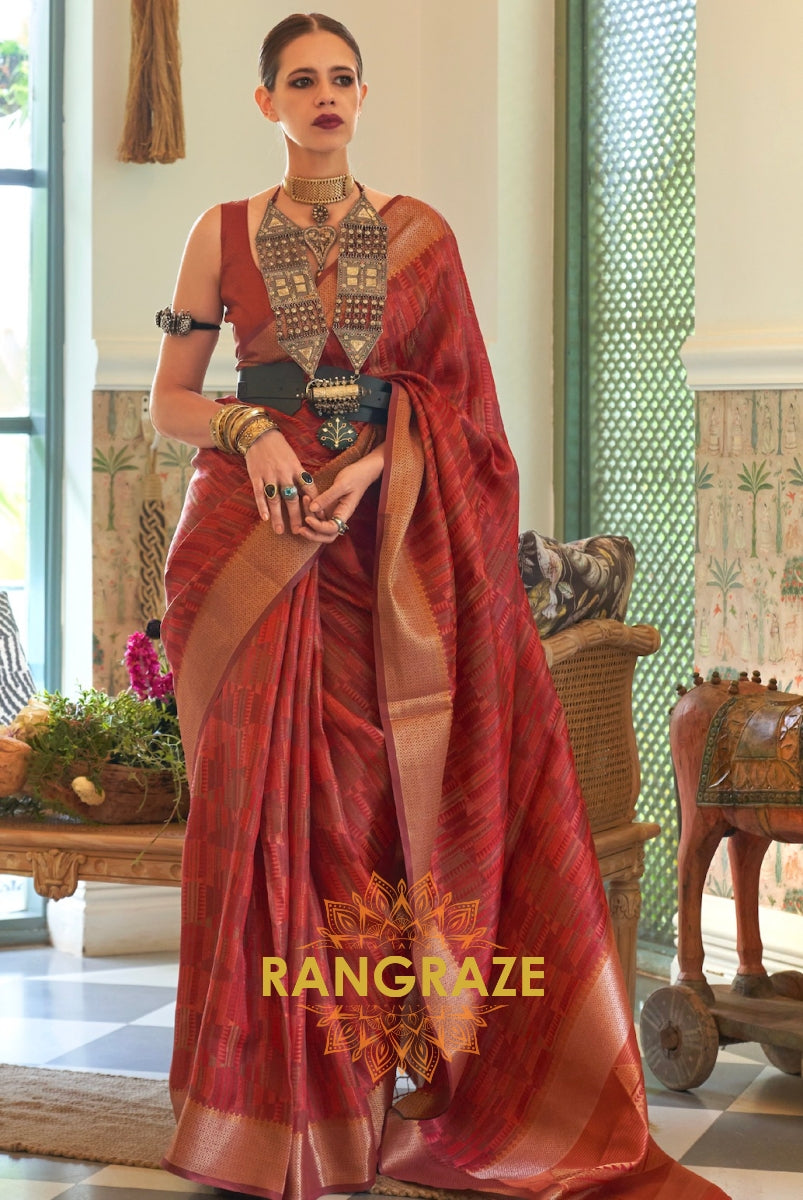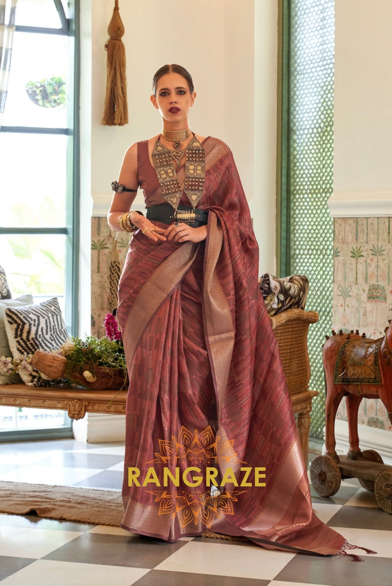 Heavy Brownish Red Woven Dual Tone Organza Silk Saree