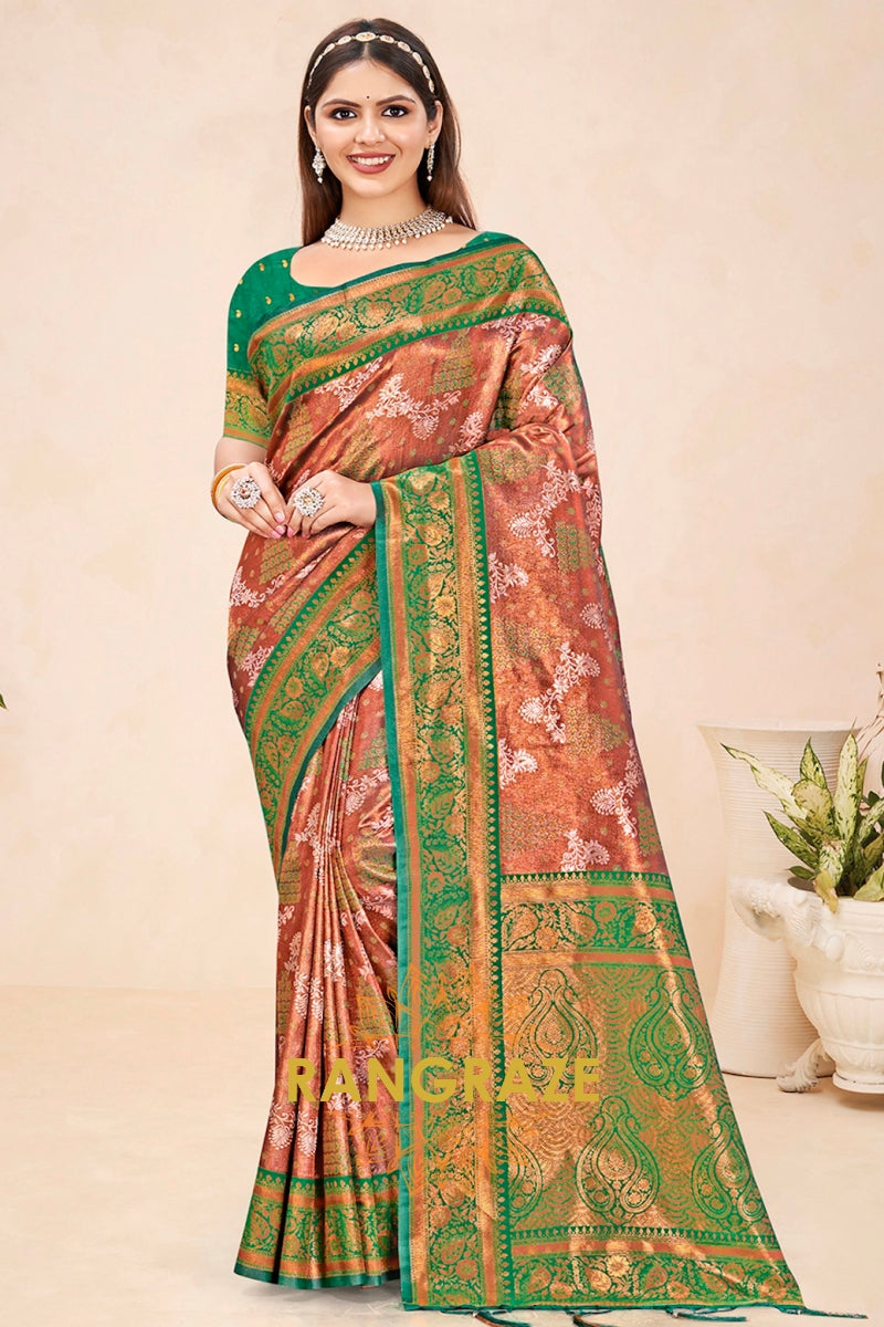 Majestic Brown Green Floral Red Kanjivaram Silk Saree With Blouse