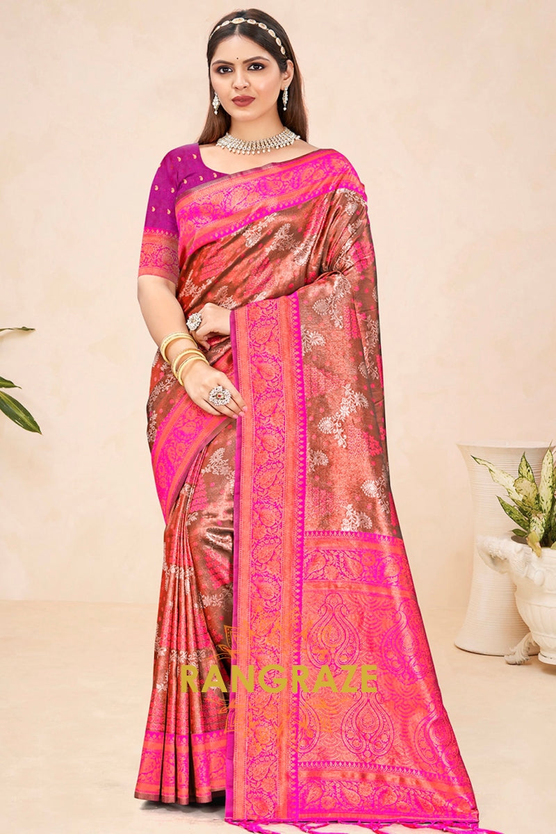 Imperial Brown Pink Floral Tussar Silk Saree With Blouse