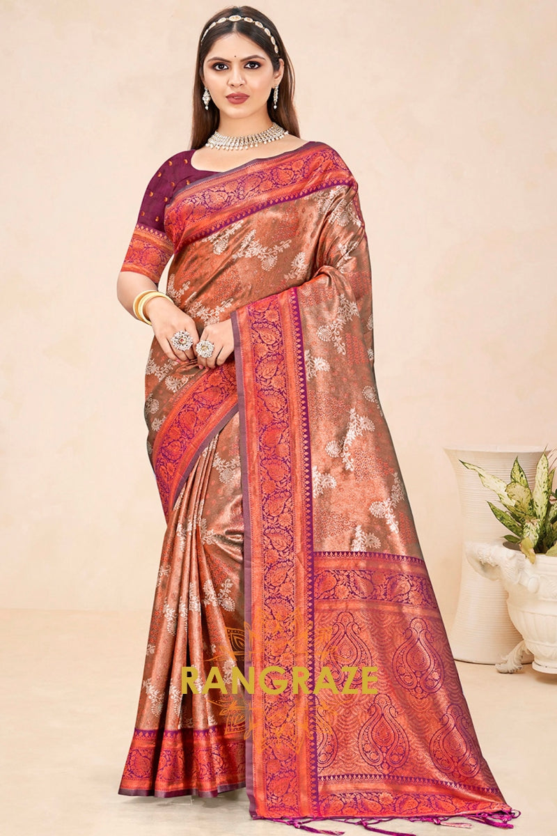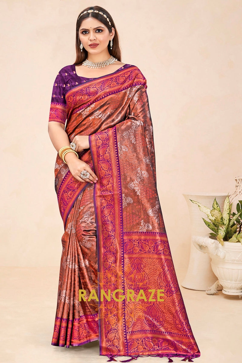 Majestic Brown Purple Floral Red Kanjivaram Silk Saree With Blouse