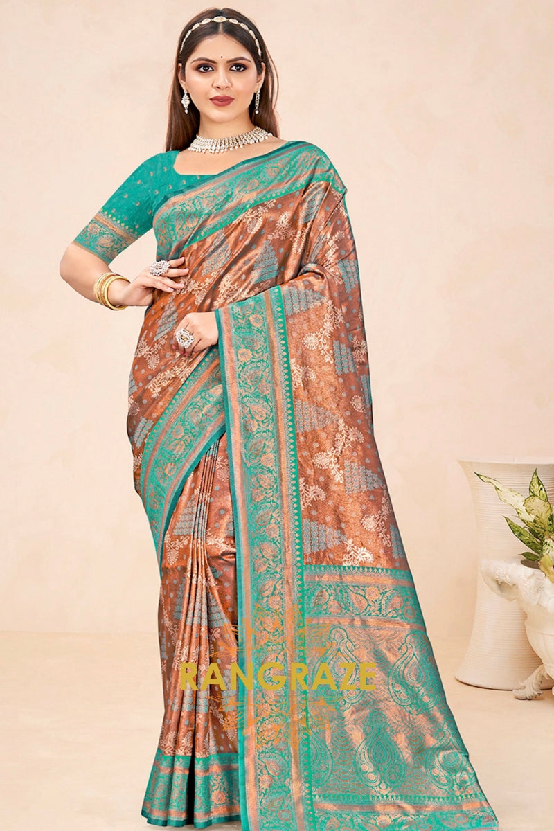 Majestic Brown Turquoise Floral Red Kanjivaram Silk Saree With Blouse