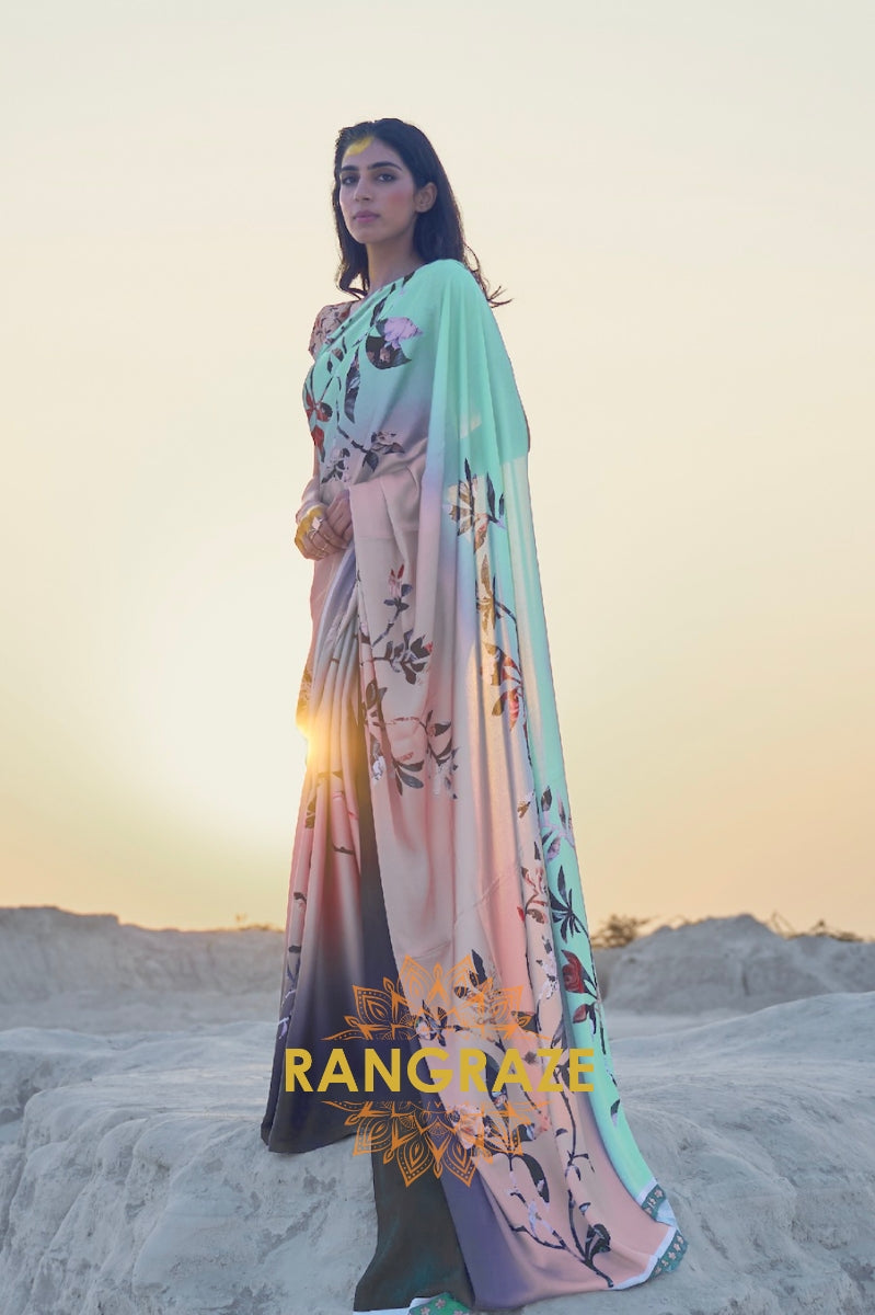 Shaded Peach Pink And Sea Green Digital Print Satin Silk Saree