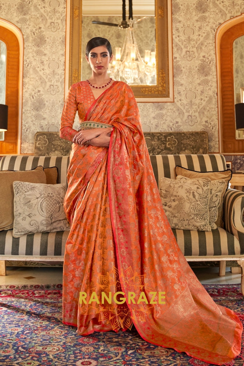 Royal Orange Zari Woven Banarasi Tussar Silk Saree