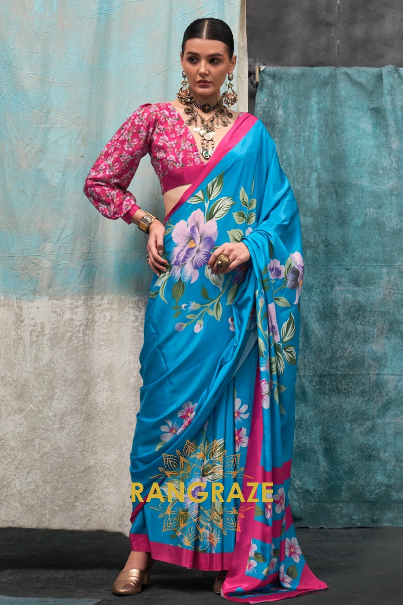 Vibrant Blue And Pink Floral Satin Crepe Saree