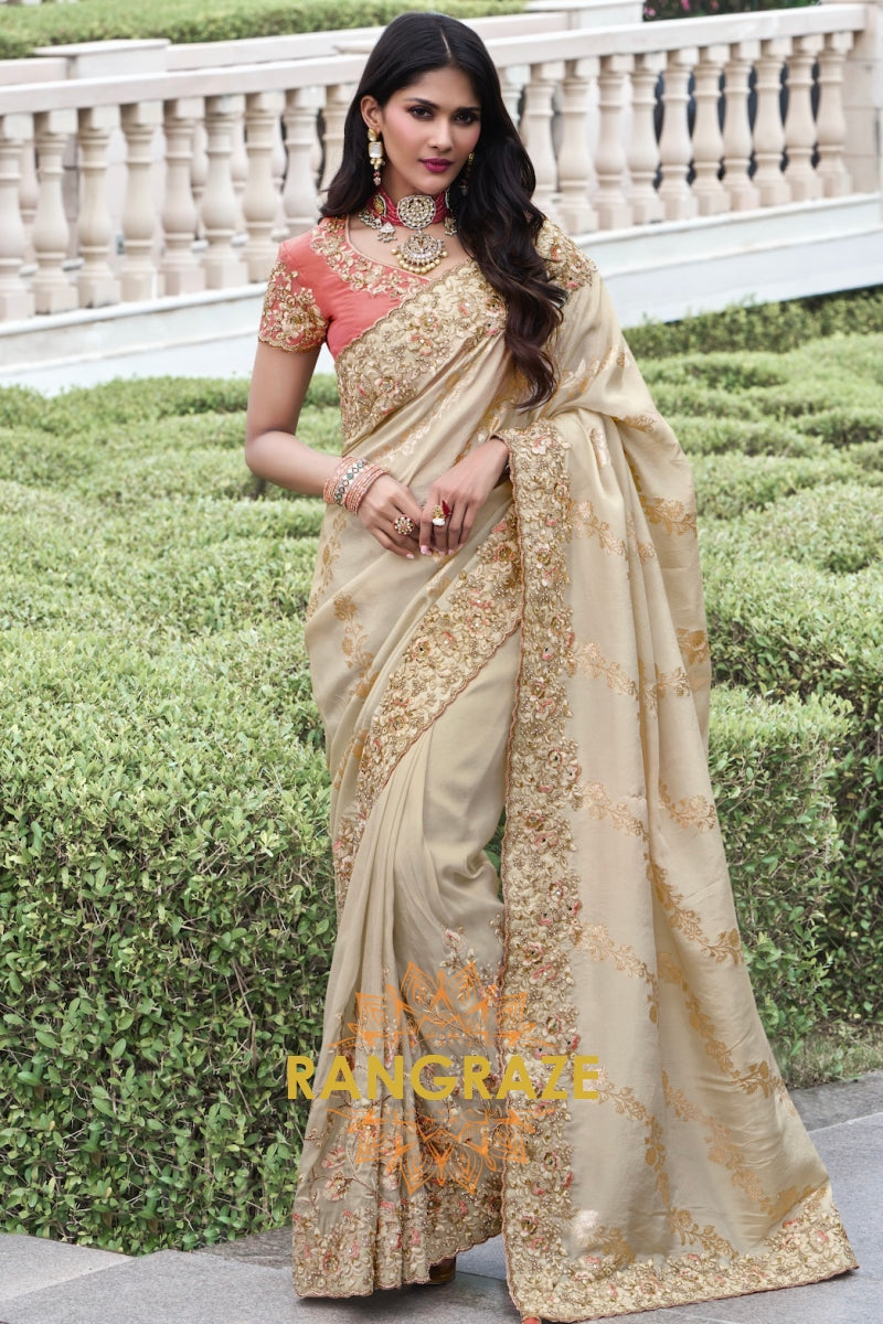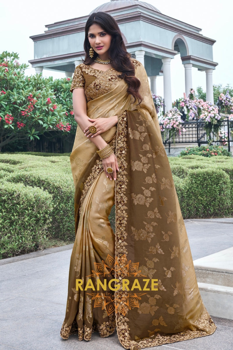 Champagne Glow Hand-Embroidered Banarasi Silk Saree