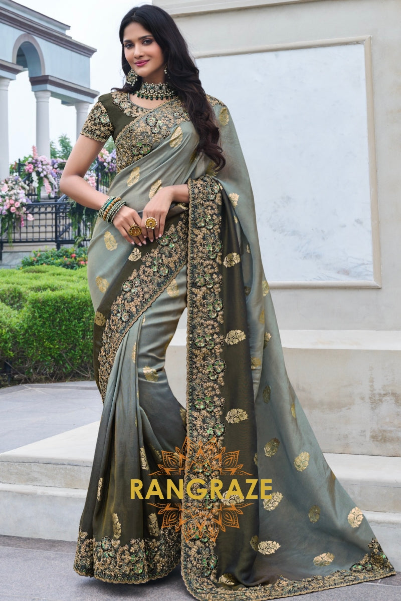 Crystal Green Bronze Zari Woven Satin Silk Saree