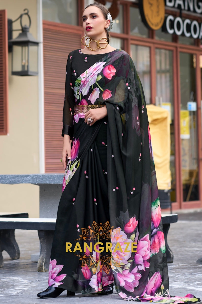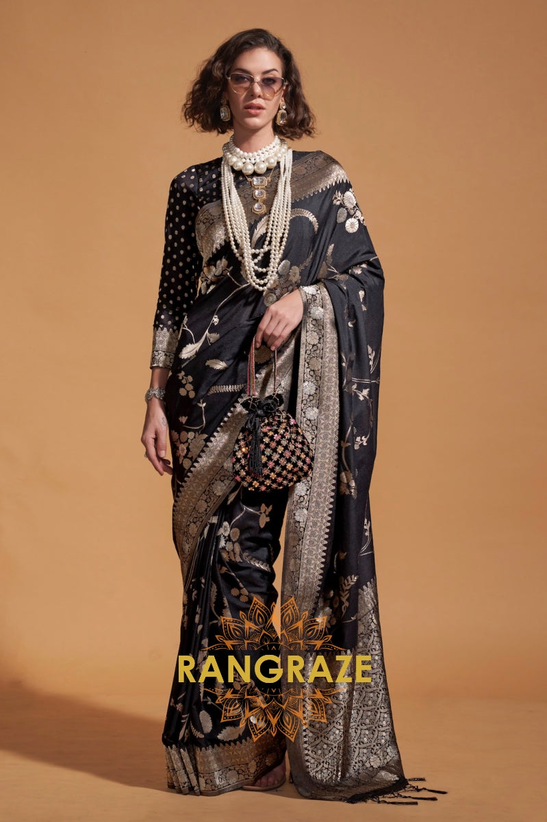Ebony Black Woven Banarasi Goergette Silk Saree