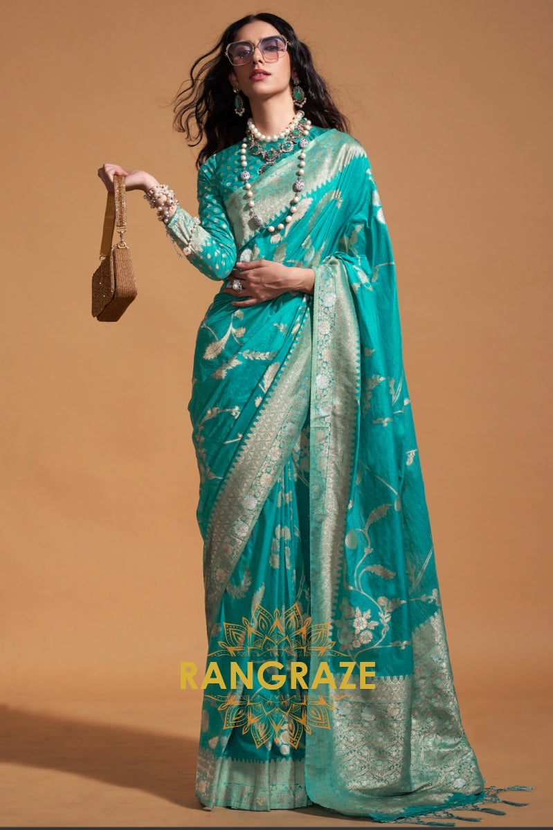 Aqua Blue Woven Banarasi Goergette Silk Saree