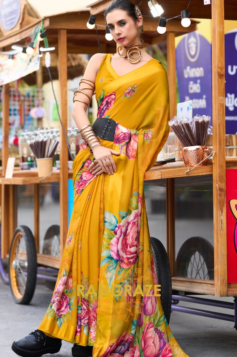 Yellow and Aqua Blue Printed Satin Georgette Saree