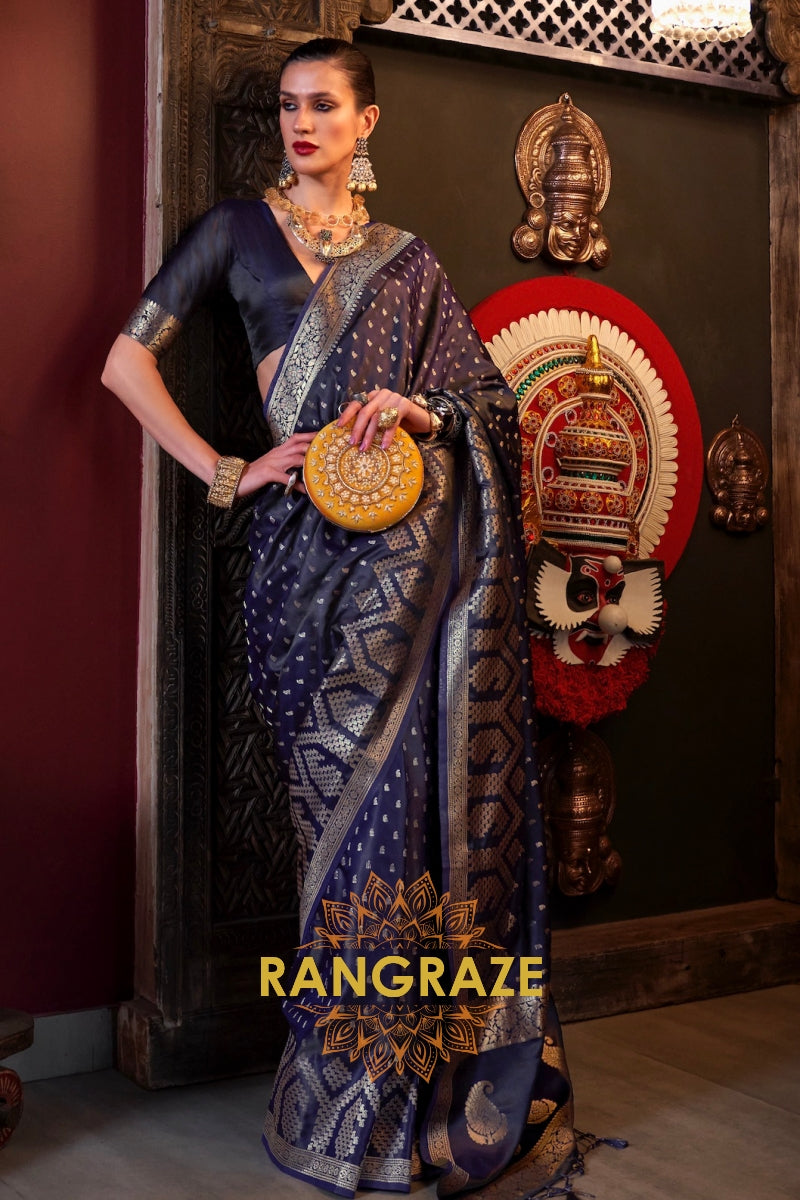 Navy Blue Woven Banarasi Satin Silk Saree