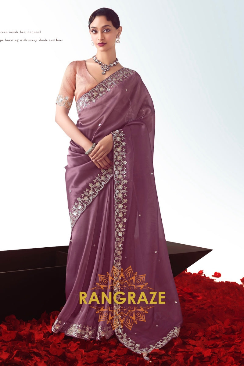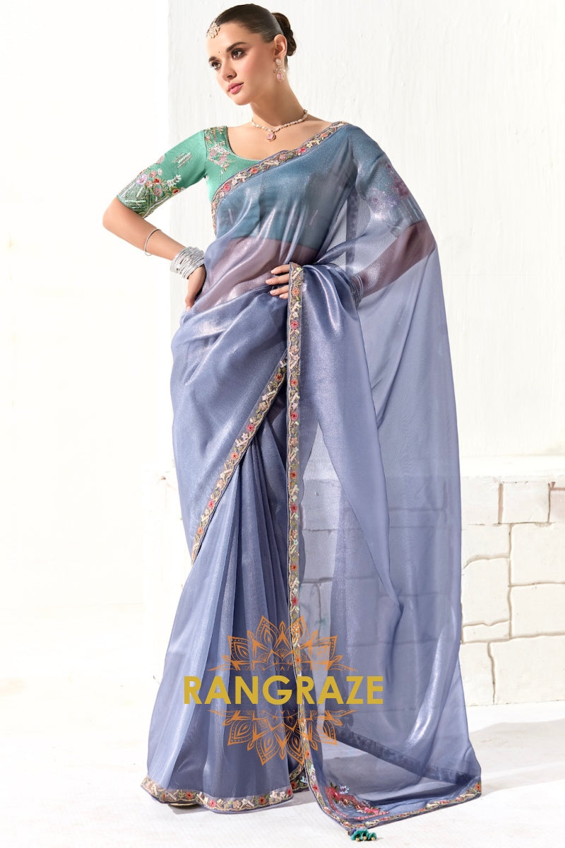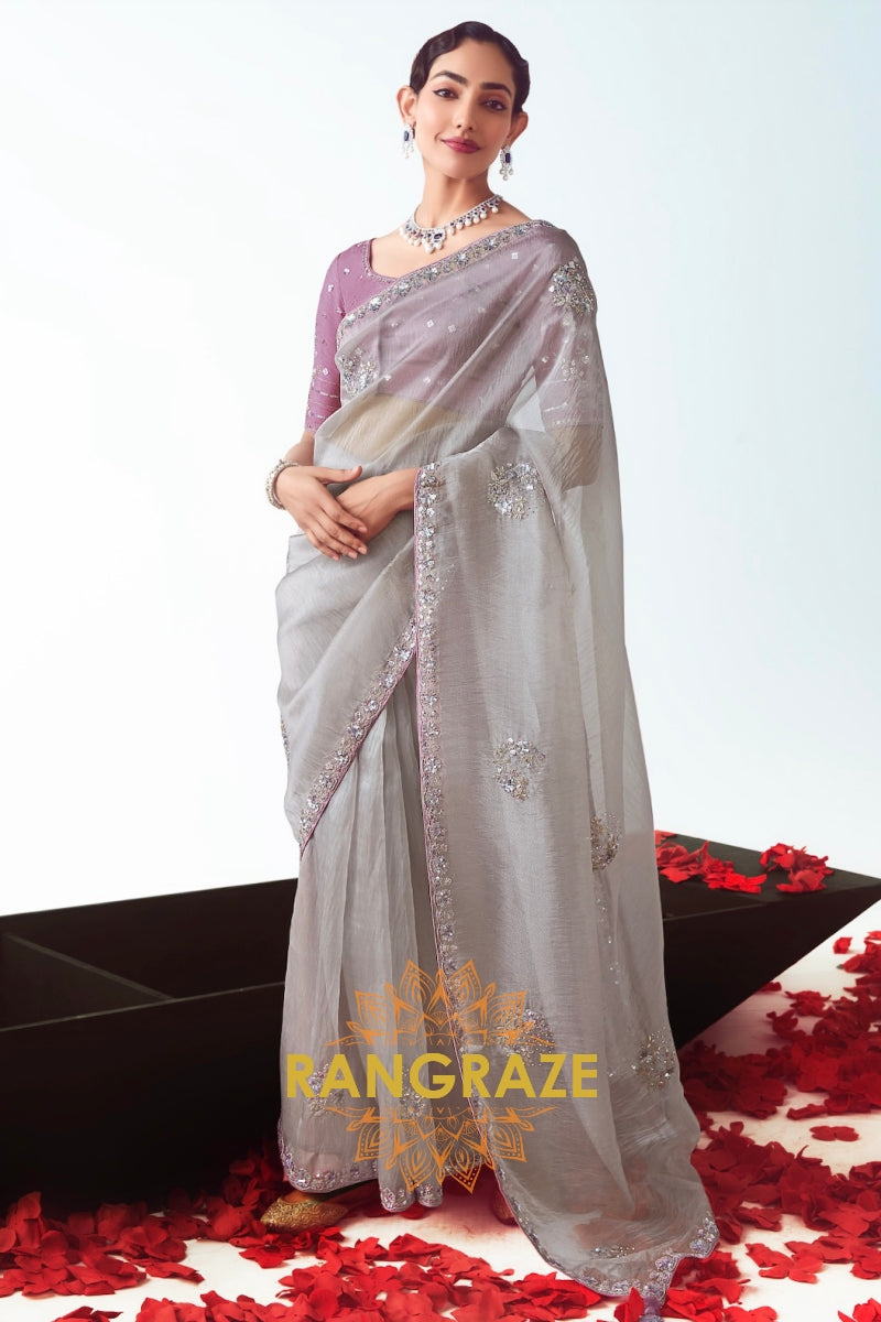 Moonlit Mist – Silver Organza Saree with Lavender Blouse