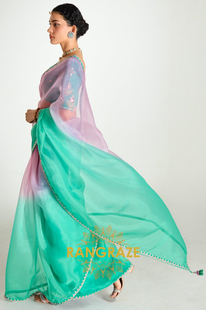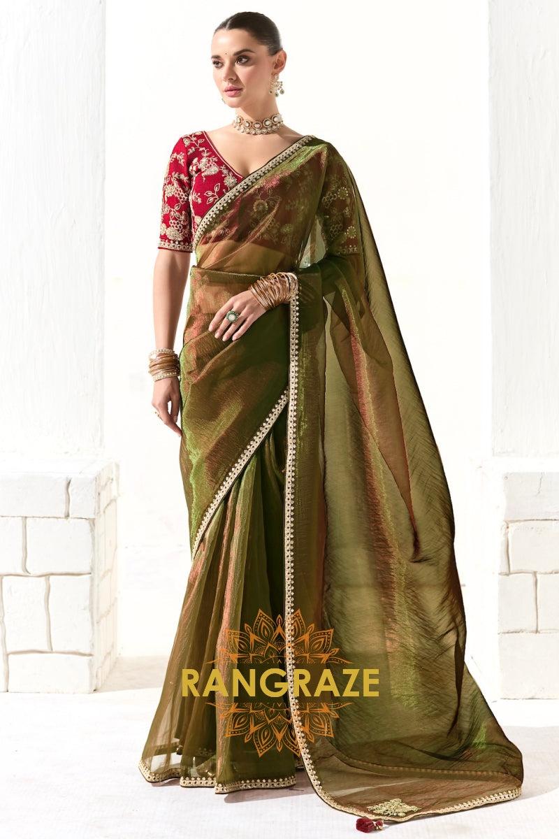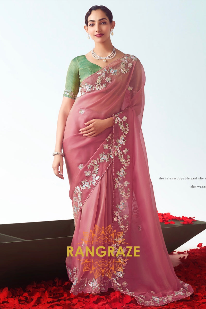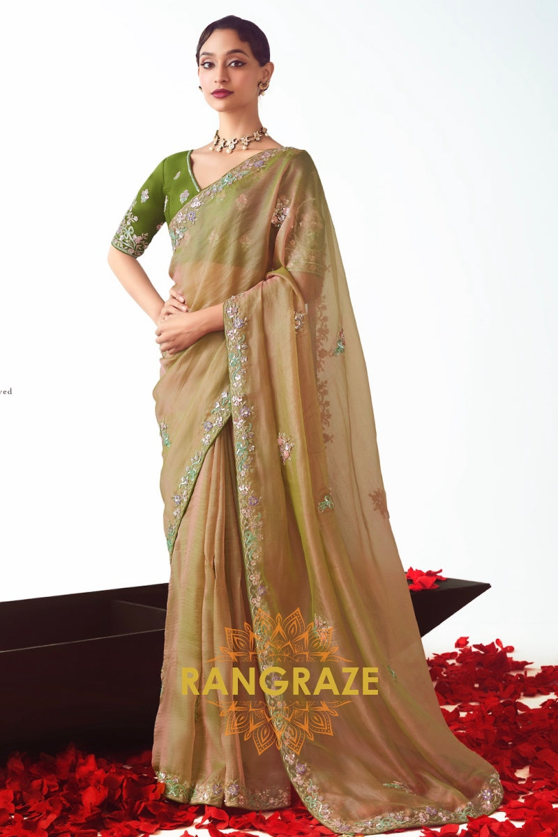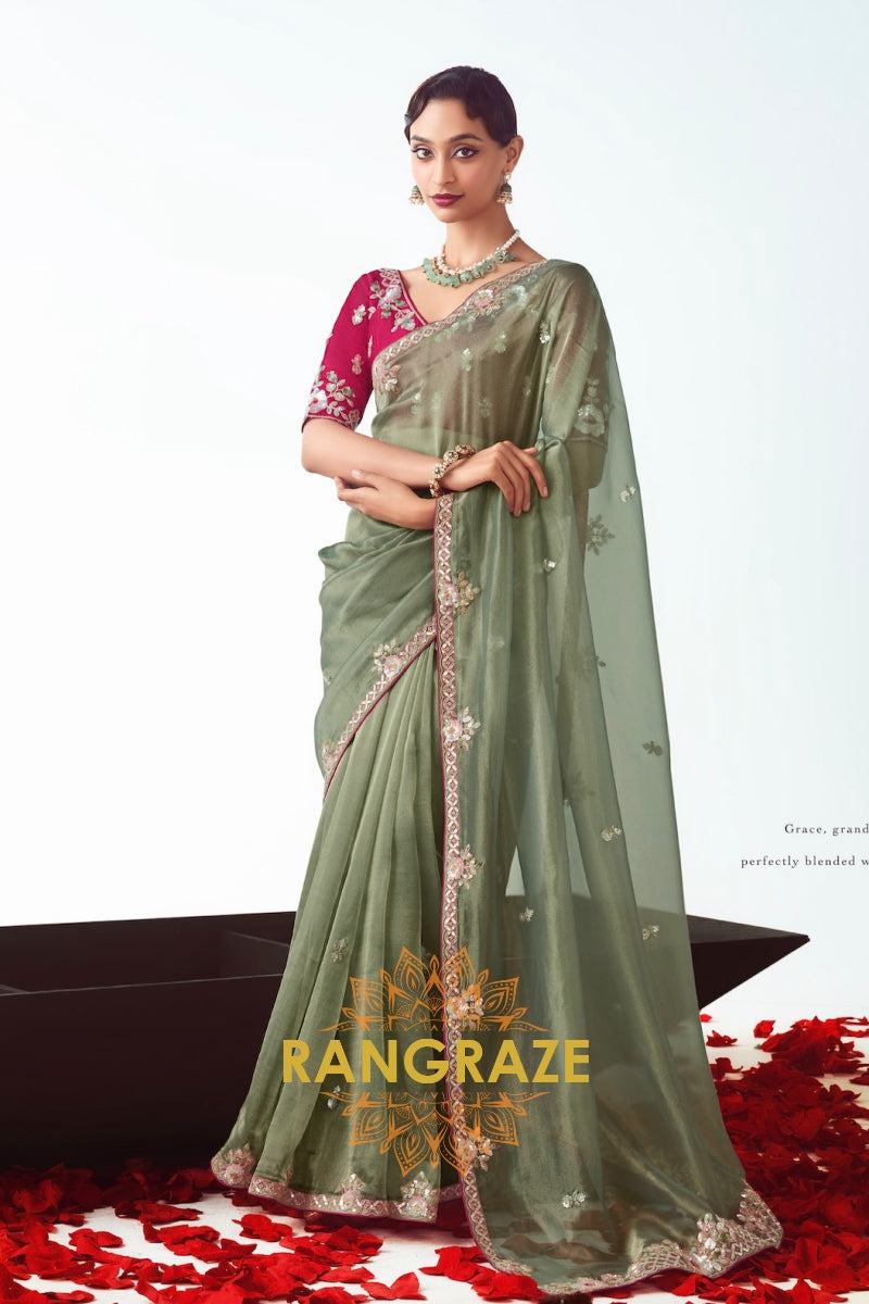 Olive Opulence Organza Saree with Rani Pink Embroidered Blouse