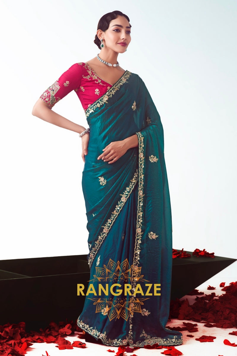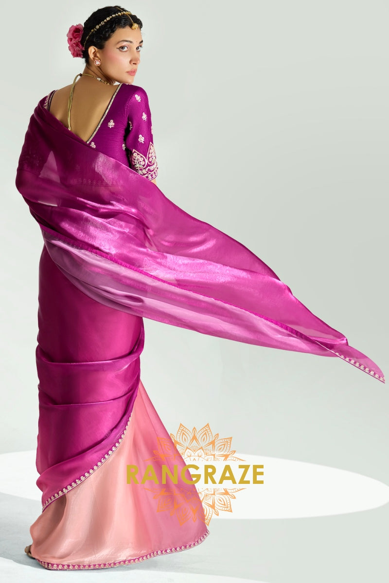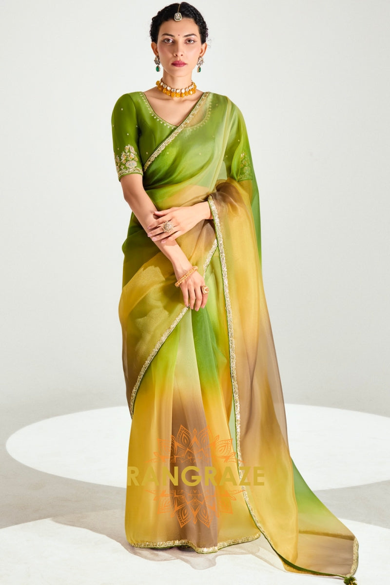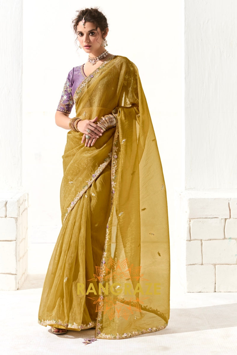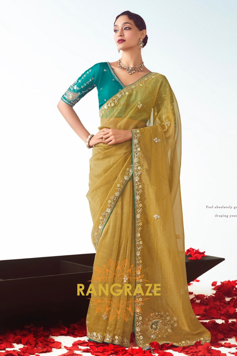 Olive Opulence Organza Saree with Rani Pink Embroidered Blouse