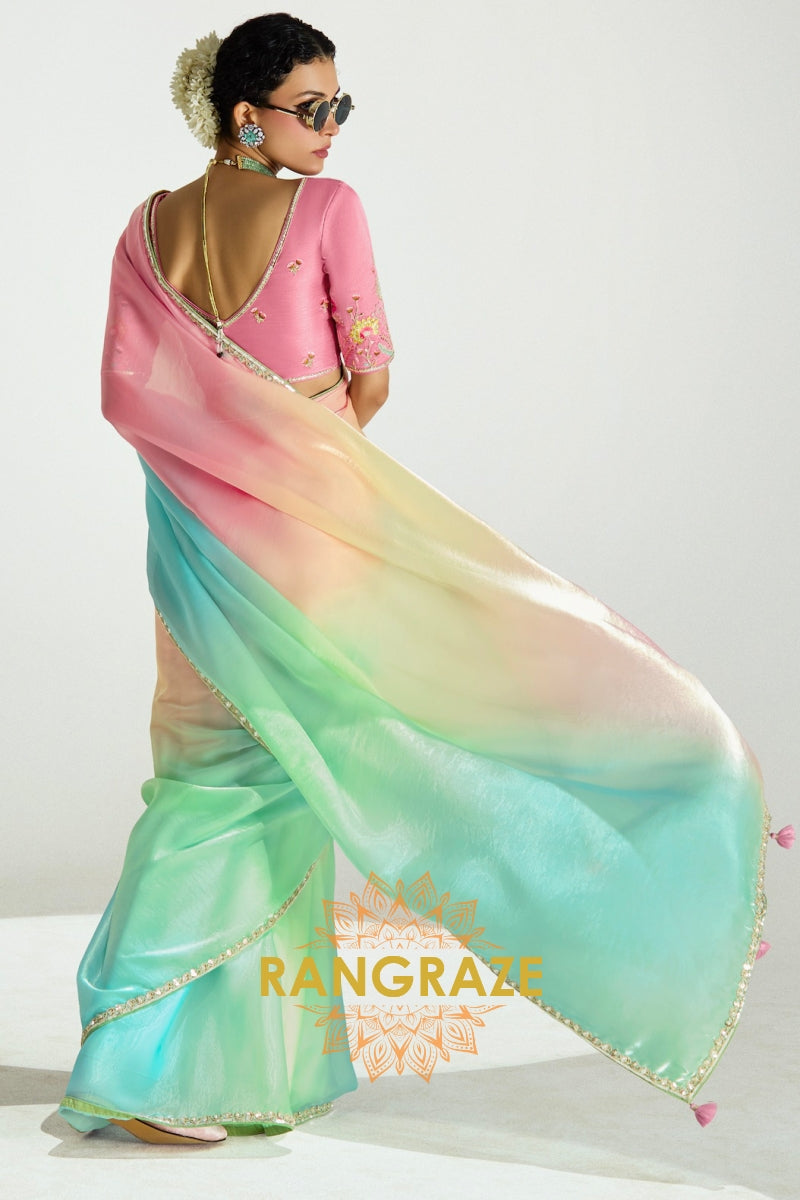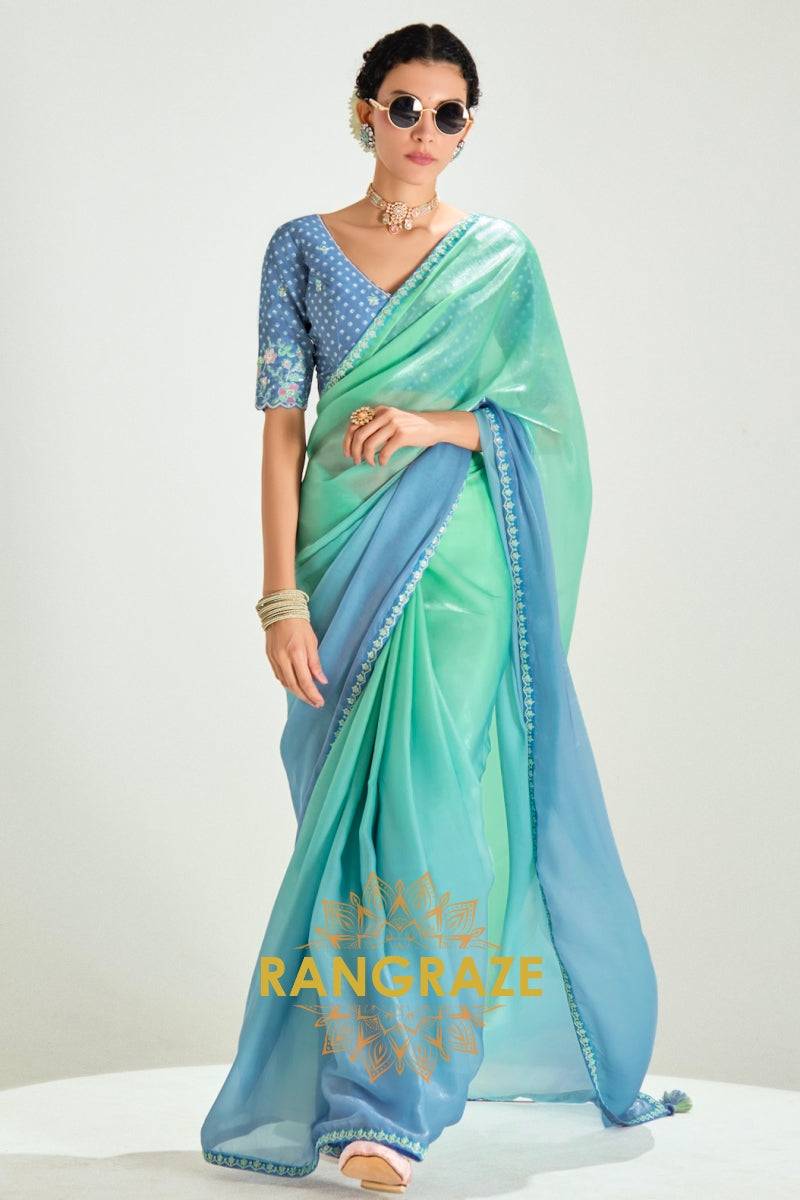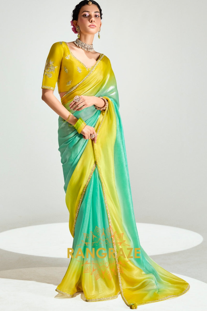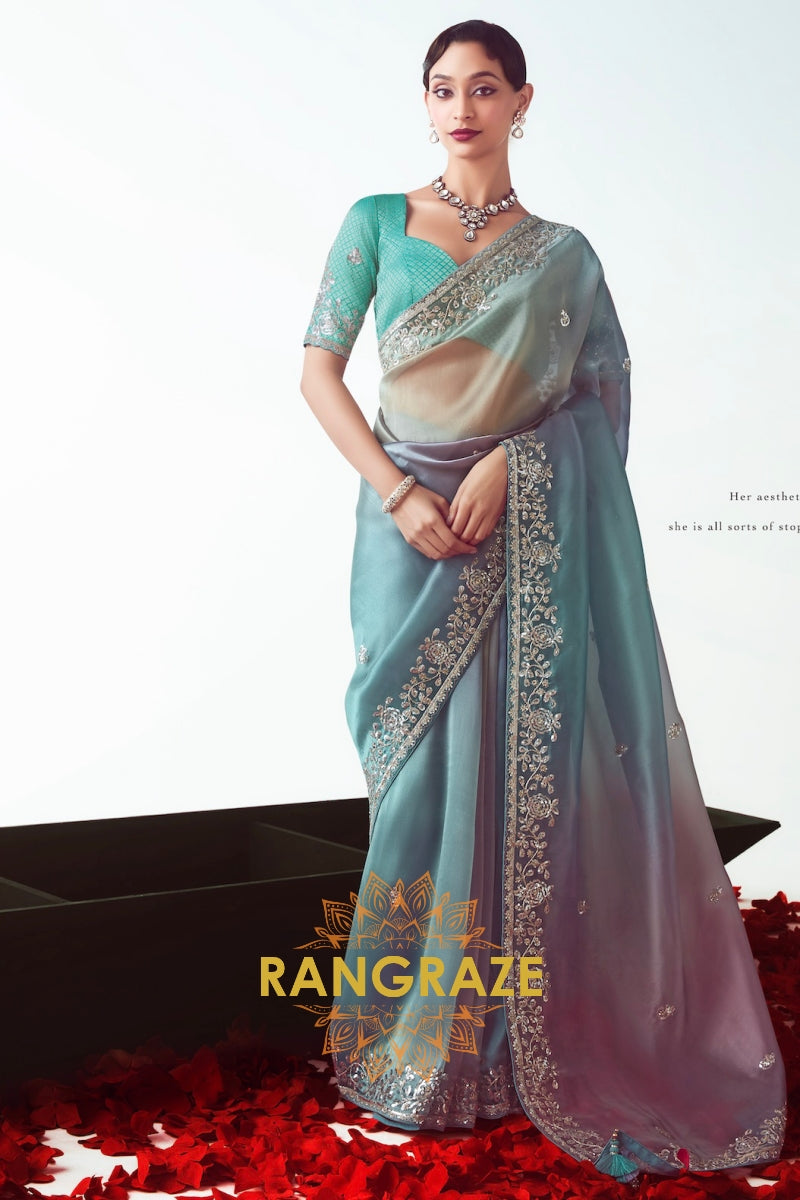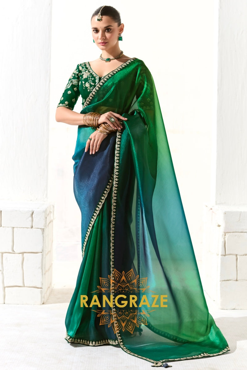 Olive Opulence Organza Saree with Rani Pink Embroidered Blouse
