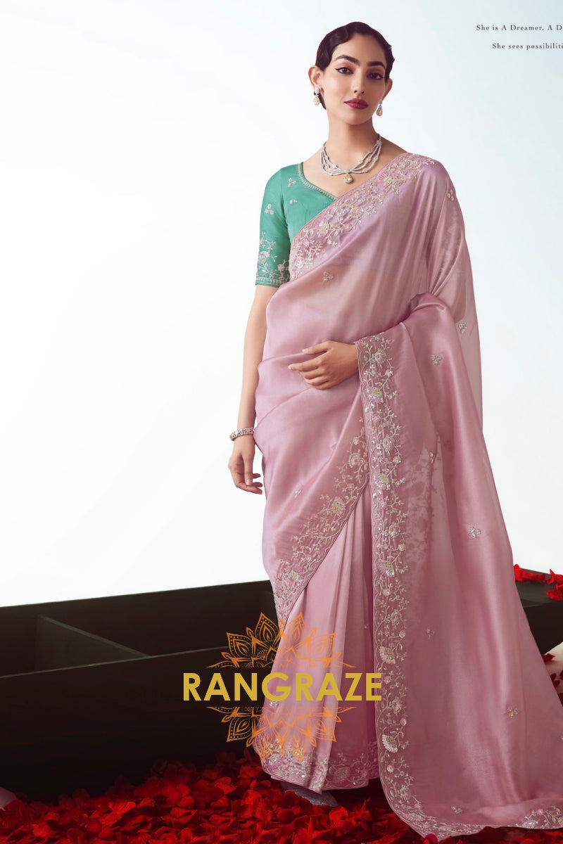 Blush Bloom Organza Saree with Embroidered Floral Handwork