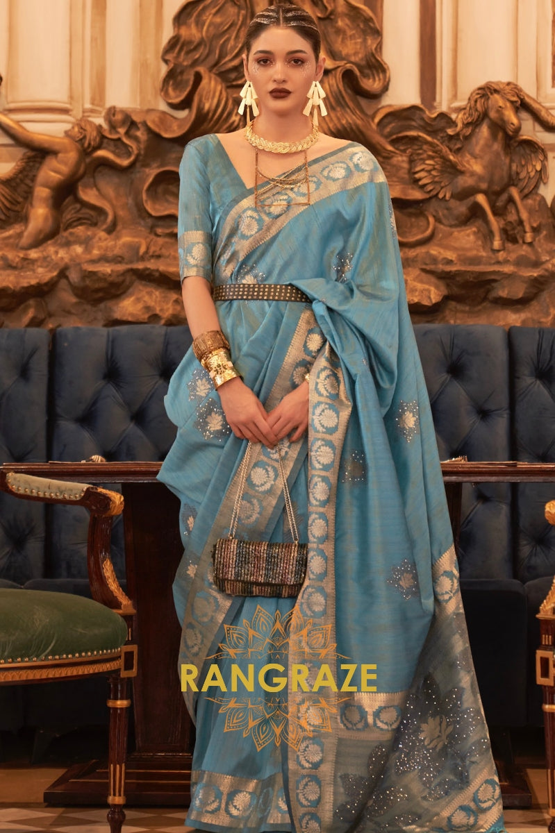 Turquoise Tusser Silk Saree With Rich Sequin Work