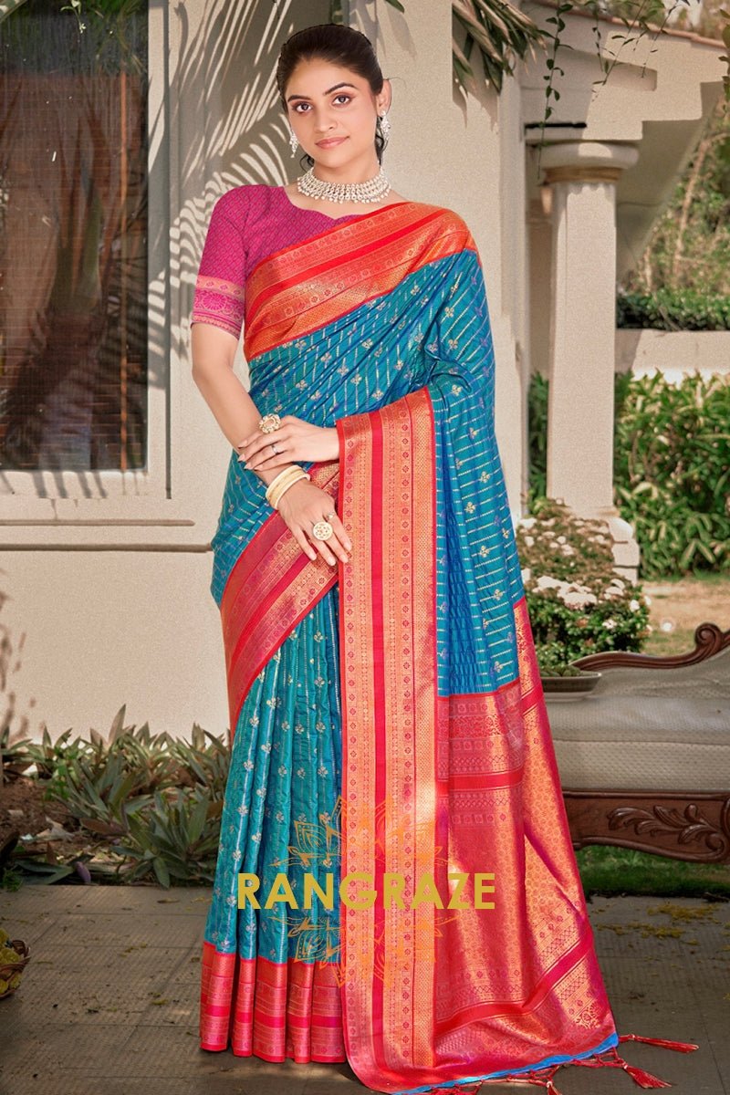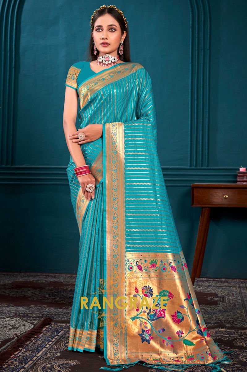 Teal Turquoise Rangkaat Woven Soft Silk Saree