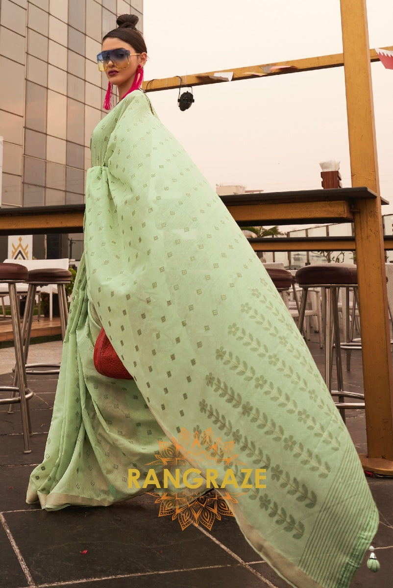 Sea Green White Zari Woven Banarasi Cotton Saree