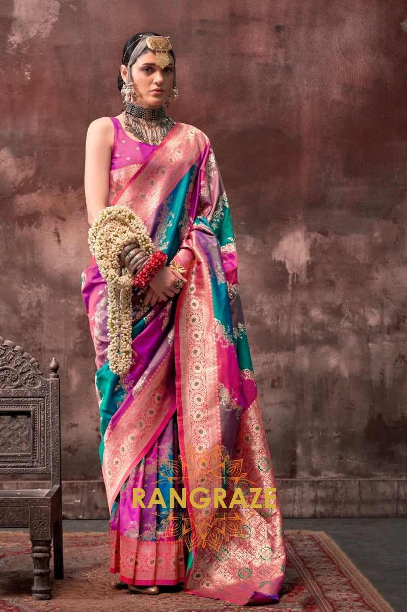 Rani Pink And Turquoise Blue Woven Banarasi Silk Saree