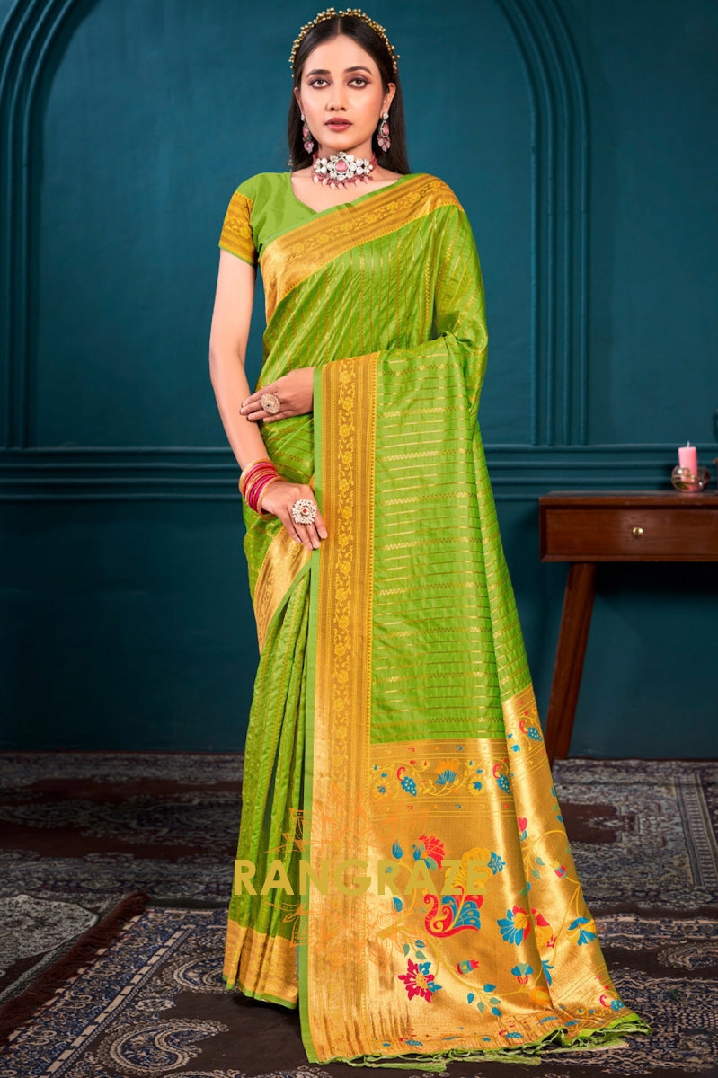 Imperial Parrot Green Golden Zari Work Paithani Silk Saree