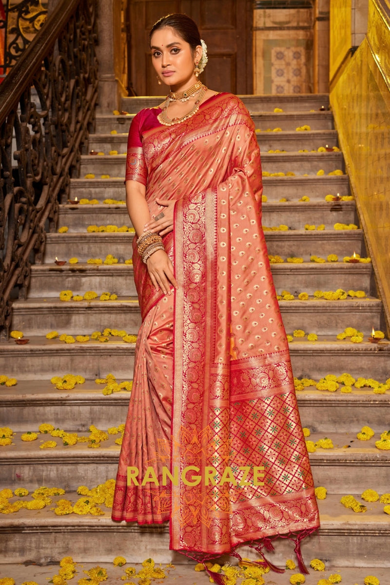 Peach Pink And Pearl White Woven Banarasi Silk Saree