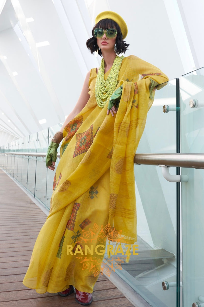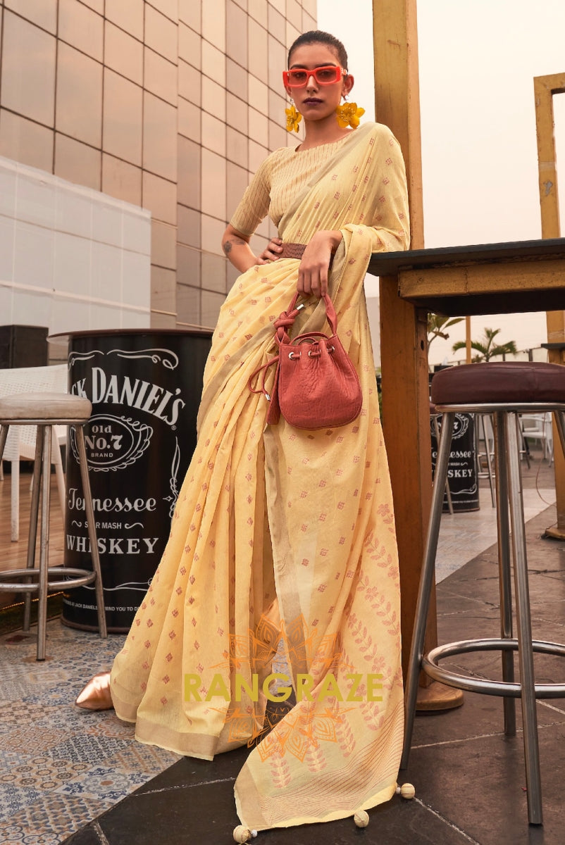 Couture Yellow Beige Woven Linen Silk Printed Saree