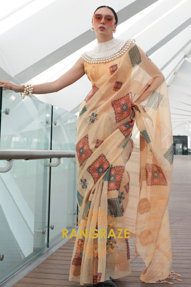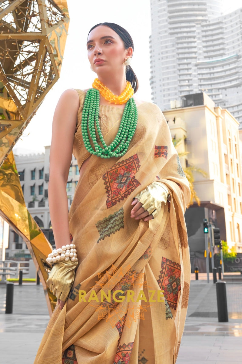 Couture Beige Yellow Woven Linen Silk Printed Saree