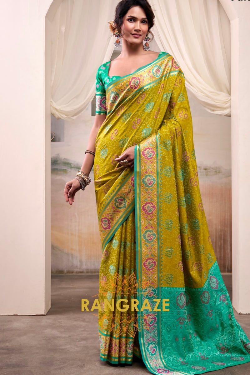 Vibrant Yellow and Green Patola Print Tusser Silk Saree