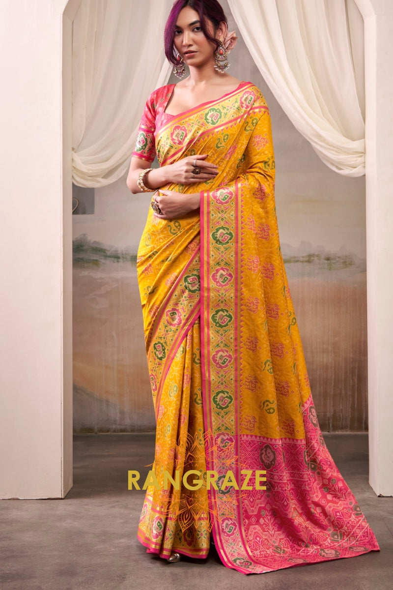 Radiant Pink and Yellow Patola Print Tusser Silk Saree