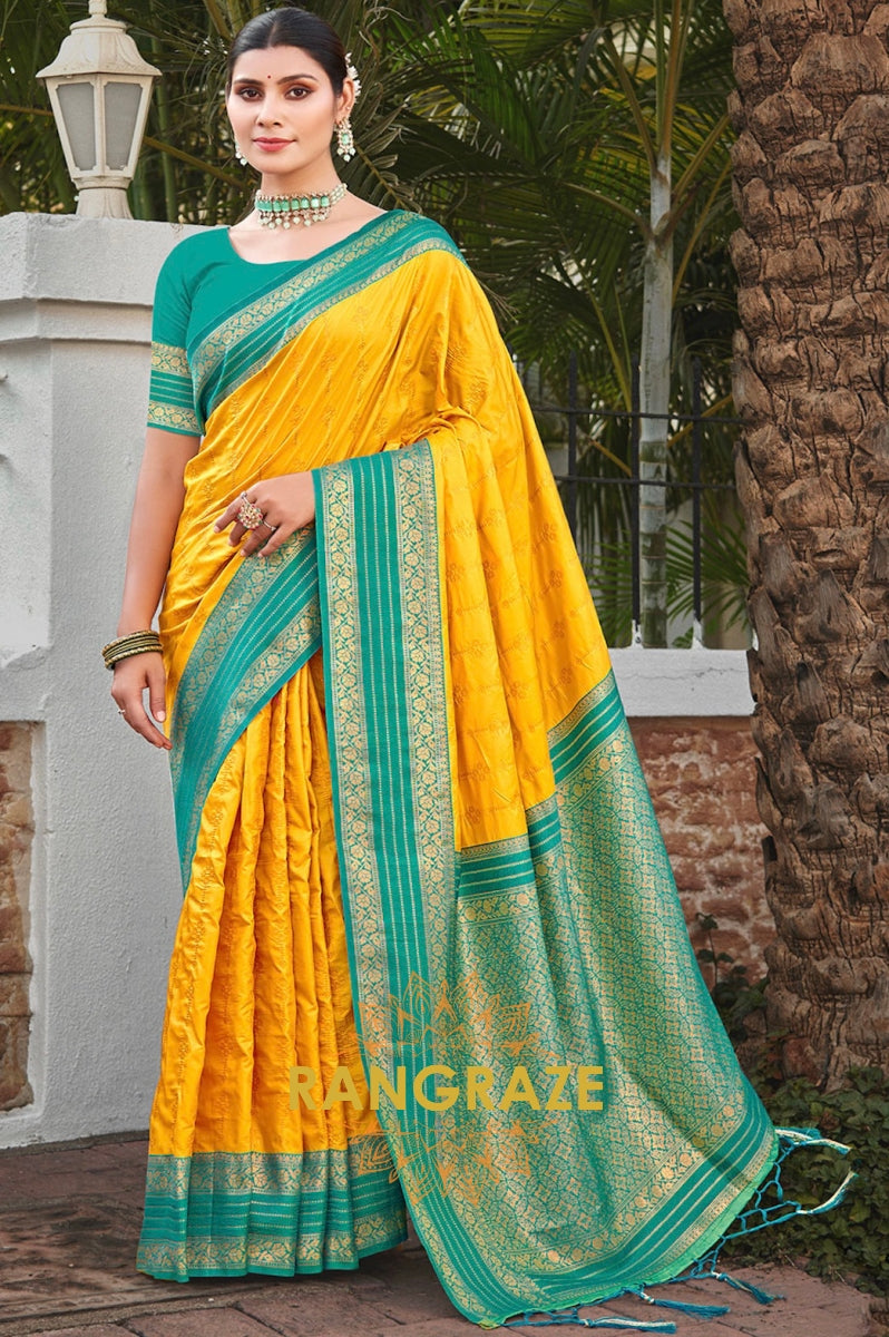 Yellow Golden Zari Banarasi Silk Saree With Matching Blouse