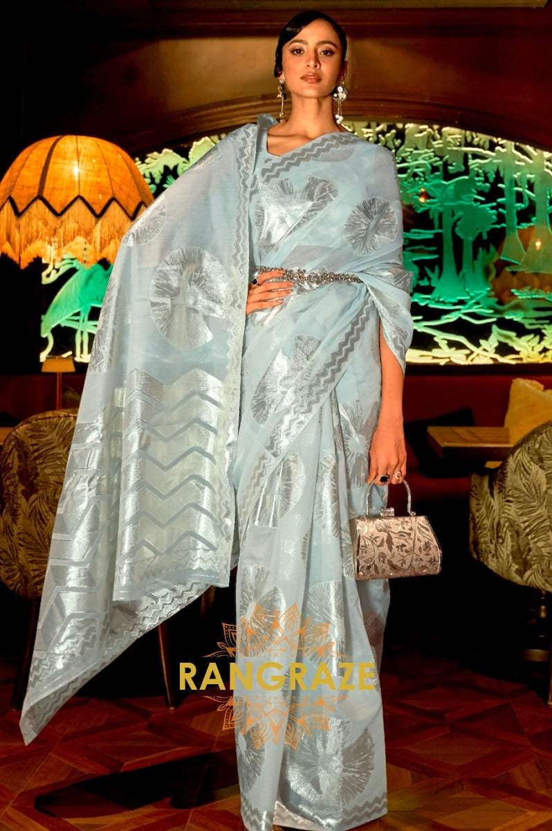 Cerulean Blue Cotton Handloom Weaving Banarasi Silk Saree