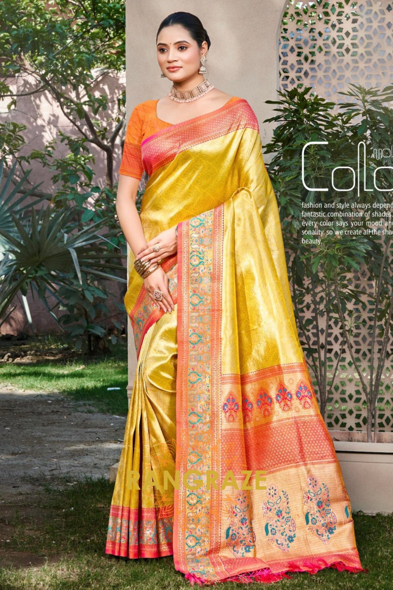 Elevate your style with our vibrant Paithani Silk saree in a radiant yellow hue. Paired...