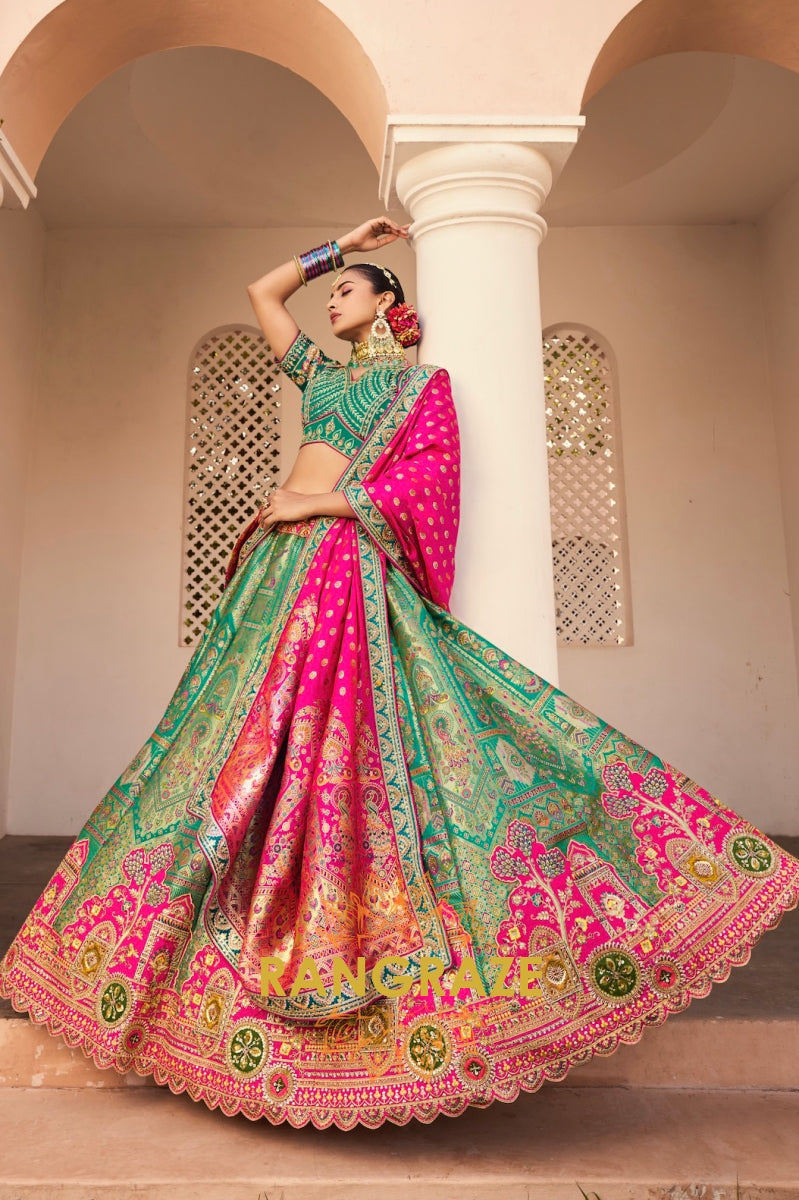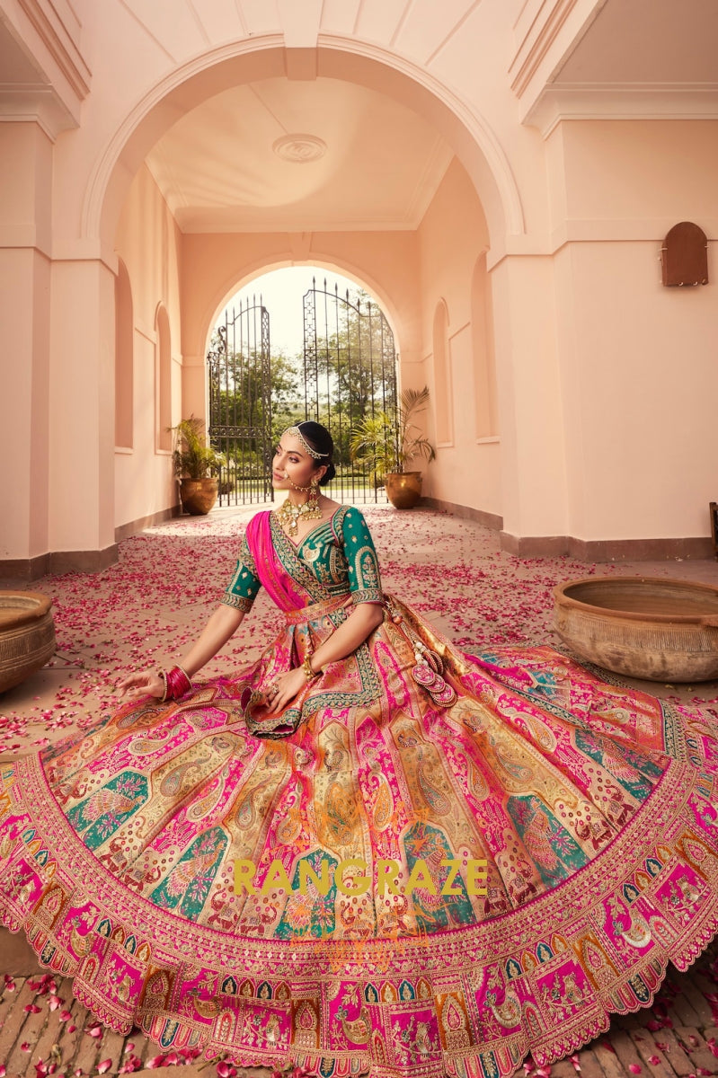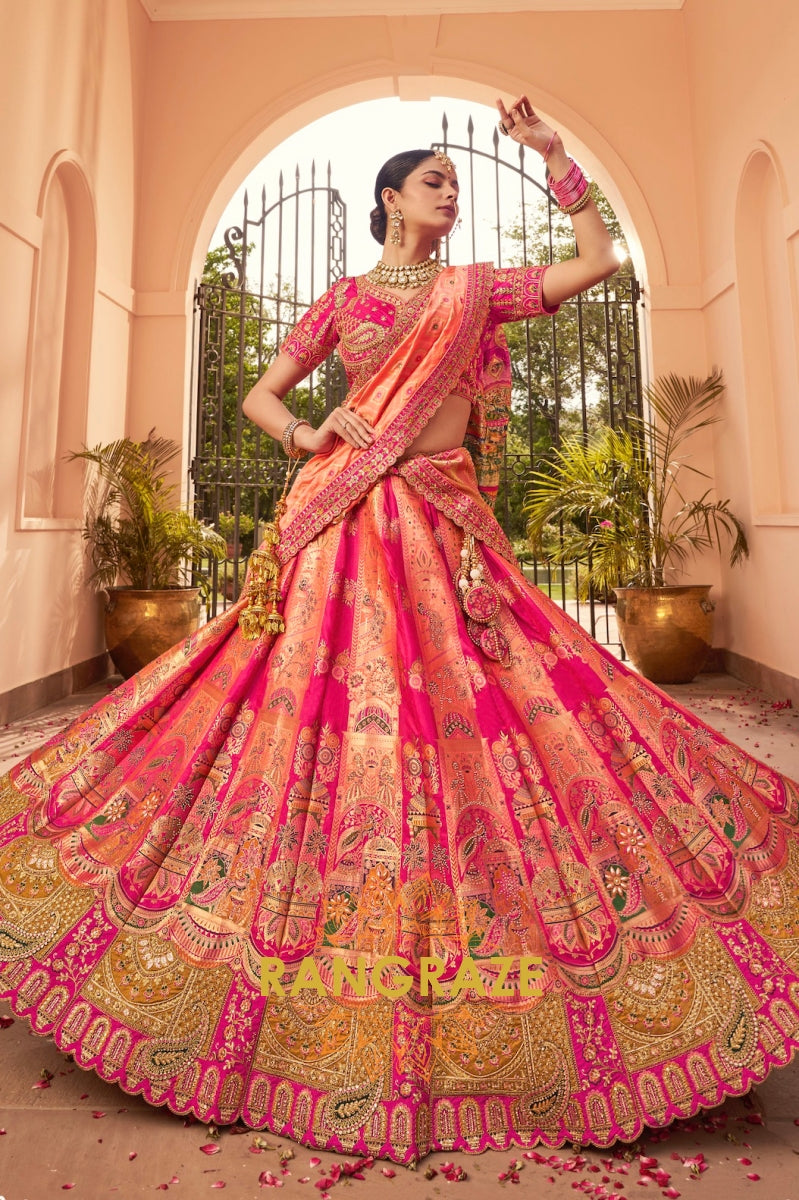 Vibrant Pink and Orange Banarasi Silk Lehenga – A Kaleidoscope of Elegance