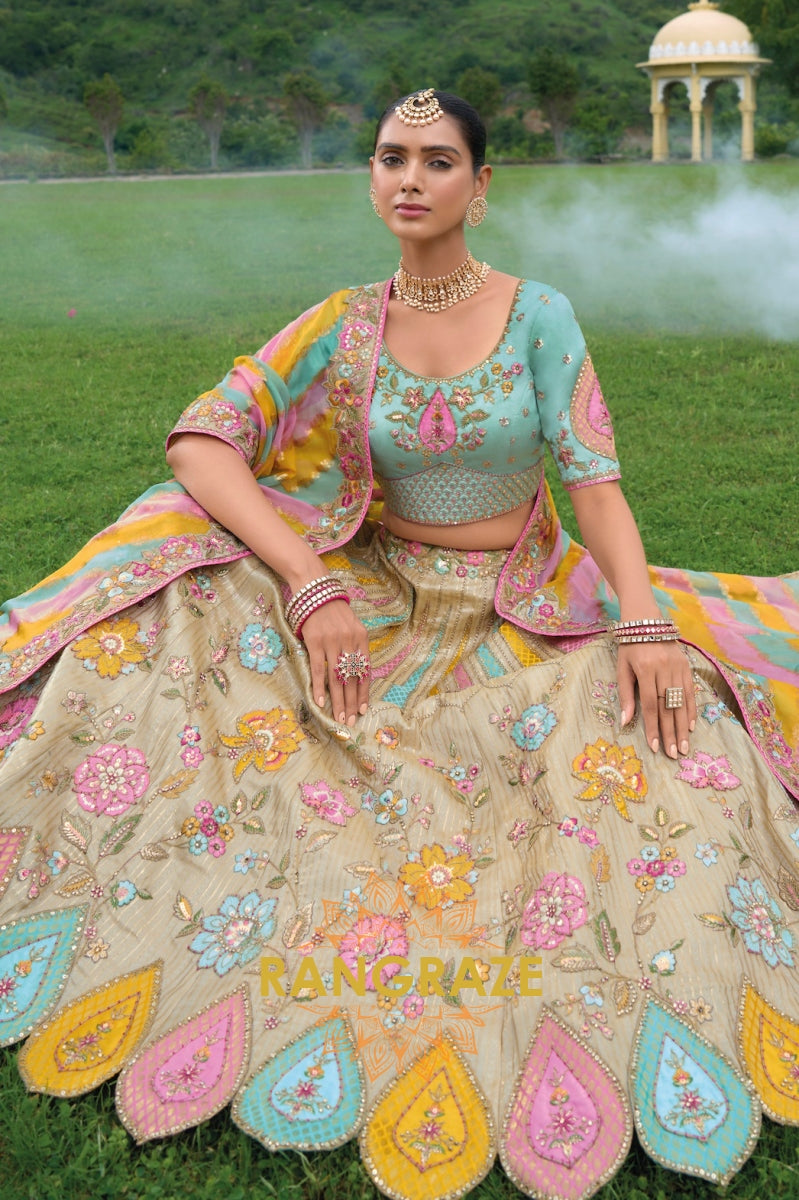 Sea Green Gold Crushed Tissue Fabric Semi-Stitched Lehenga Choli with Moti and Zari Embroidery