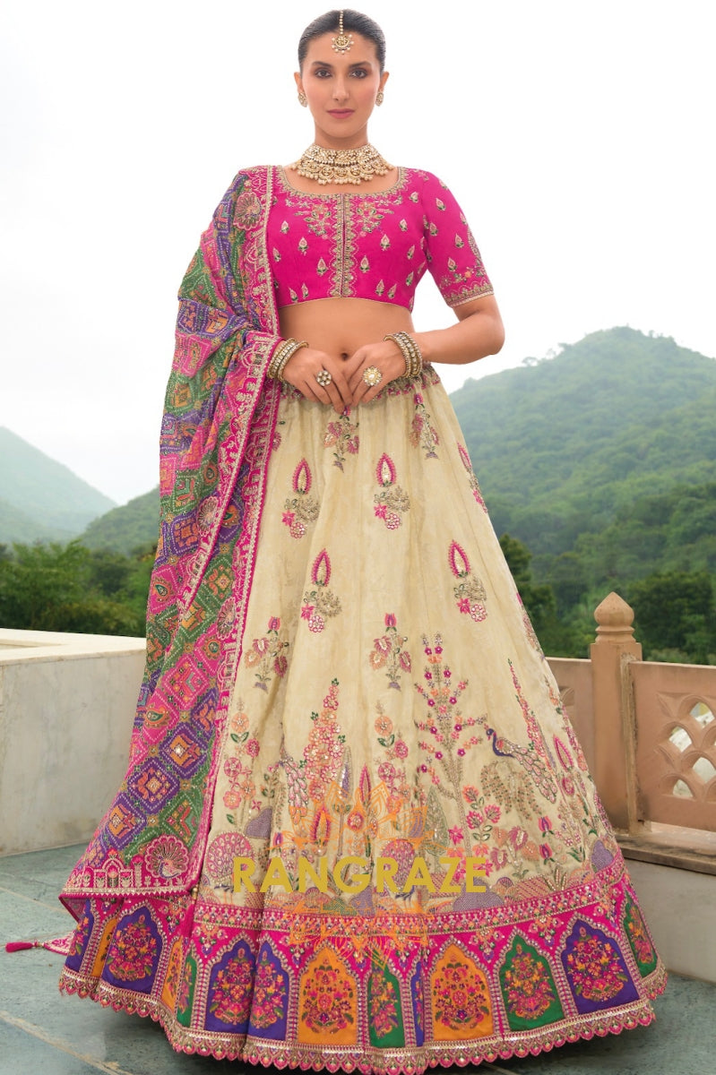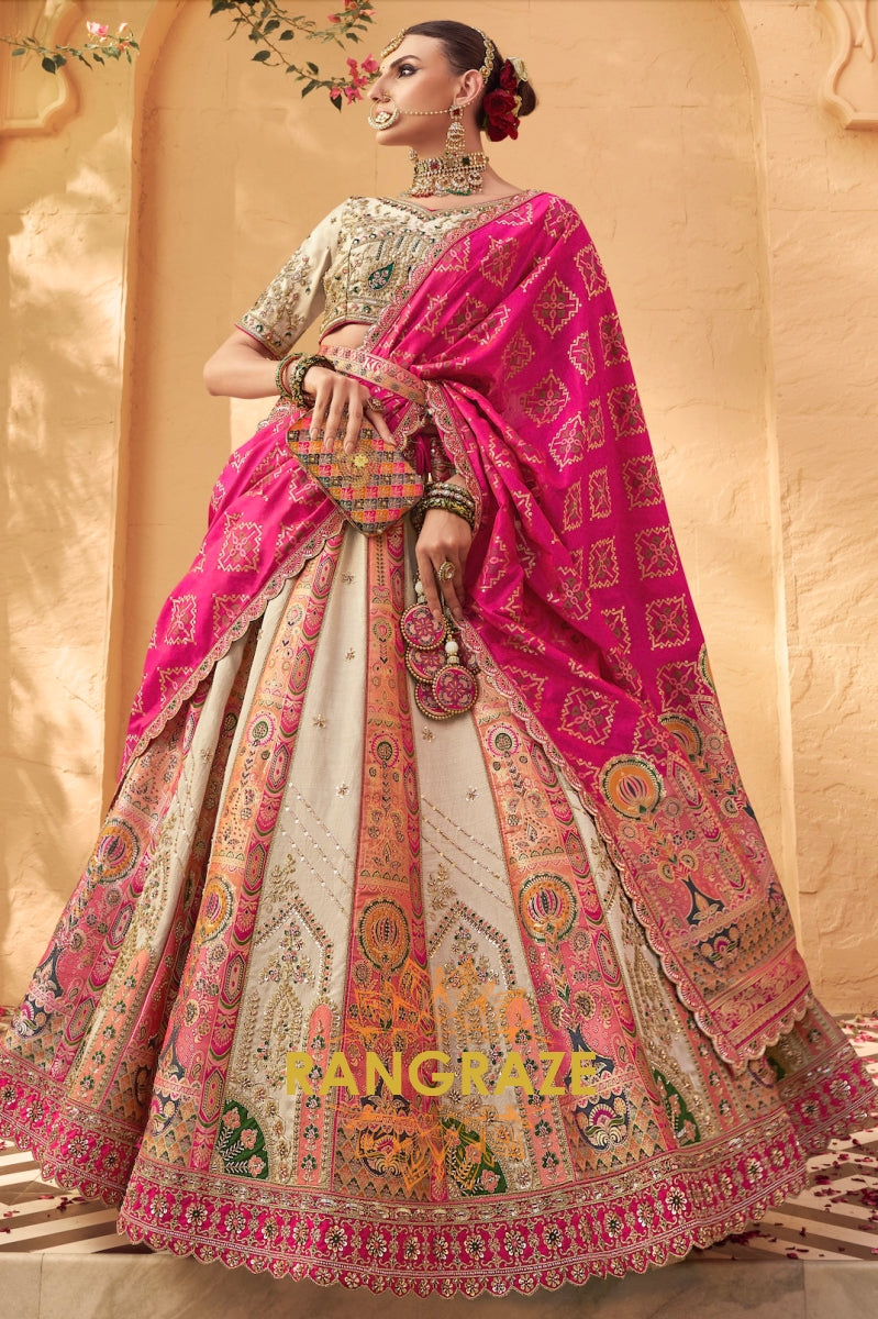 Vibrant Charm Ivory and Fuchsia Multicolor Banarasi Lehenga – A Symphony of Art and Elegance