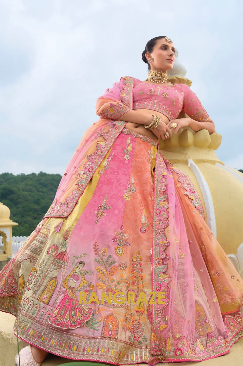 Royal Sunrise Pink and Yellow Handcrafted Heritage Lehenga – A Celebration of Regal Artistry
