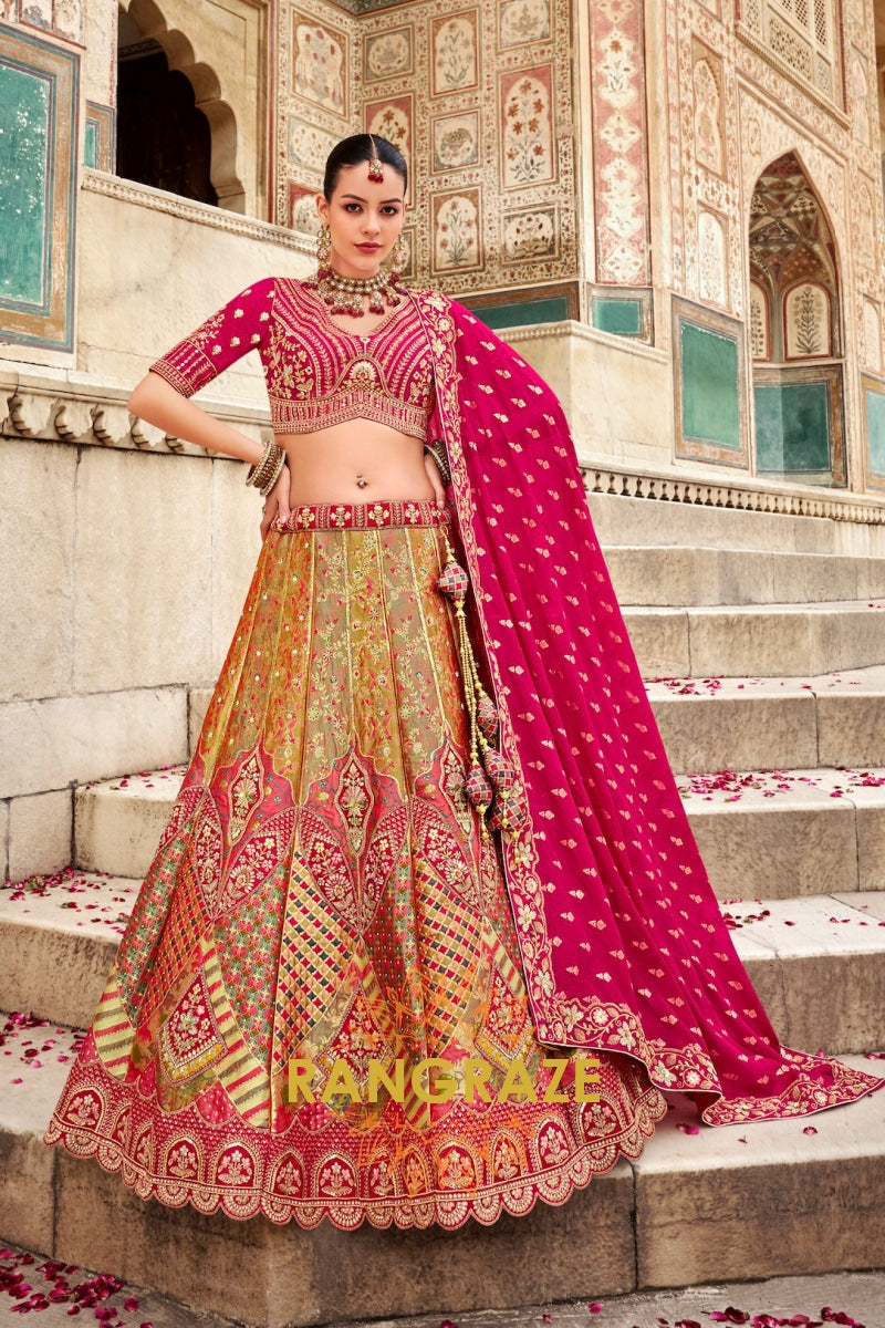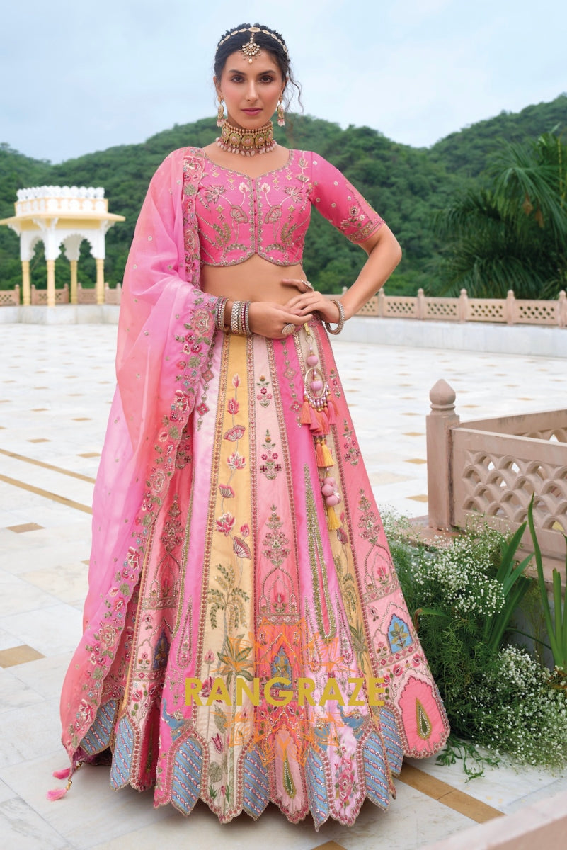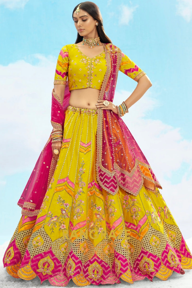 Radiant Yellow and Pink Embroidered Silk Lehenga Set