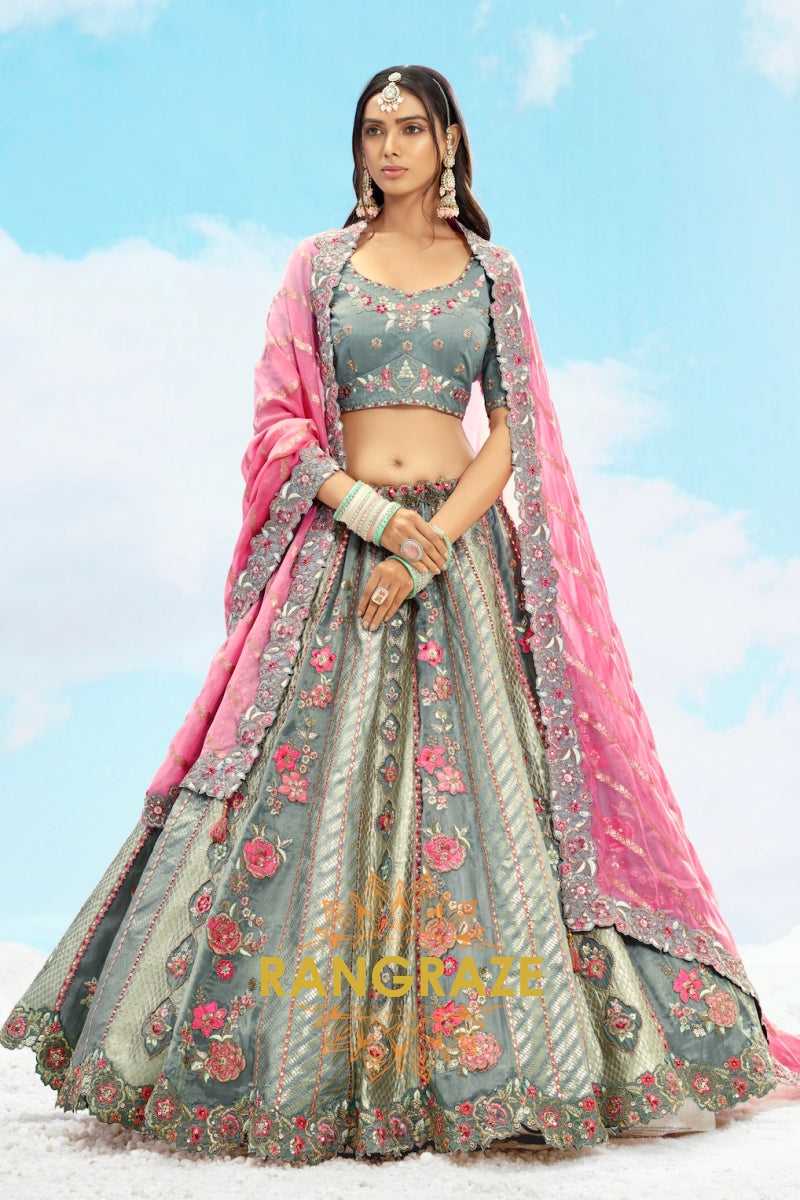 Slate Grey and Rose Pink Floral Embroidered Silk Lehenga Set