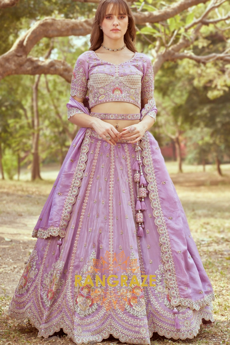 Lavender Gold Crushed Tissue Fabric Semi-Stitched Lehenga Choli with Moti and Zari Embroidery