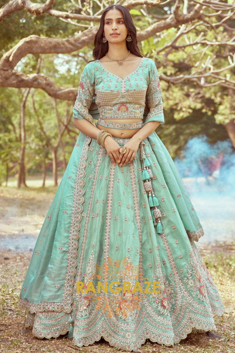 Lehenga: Crafted from premium sea green crushed tissue fabric, this semi-stitched lehenga features a luxurious...