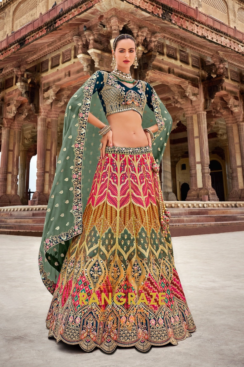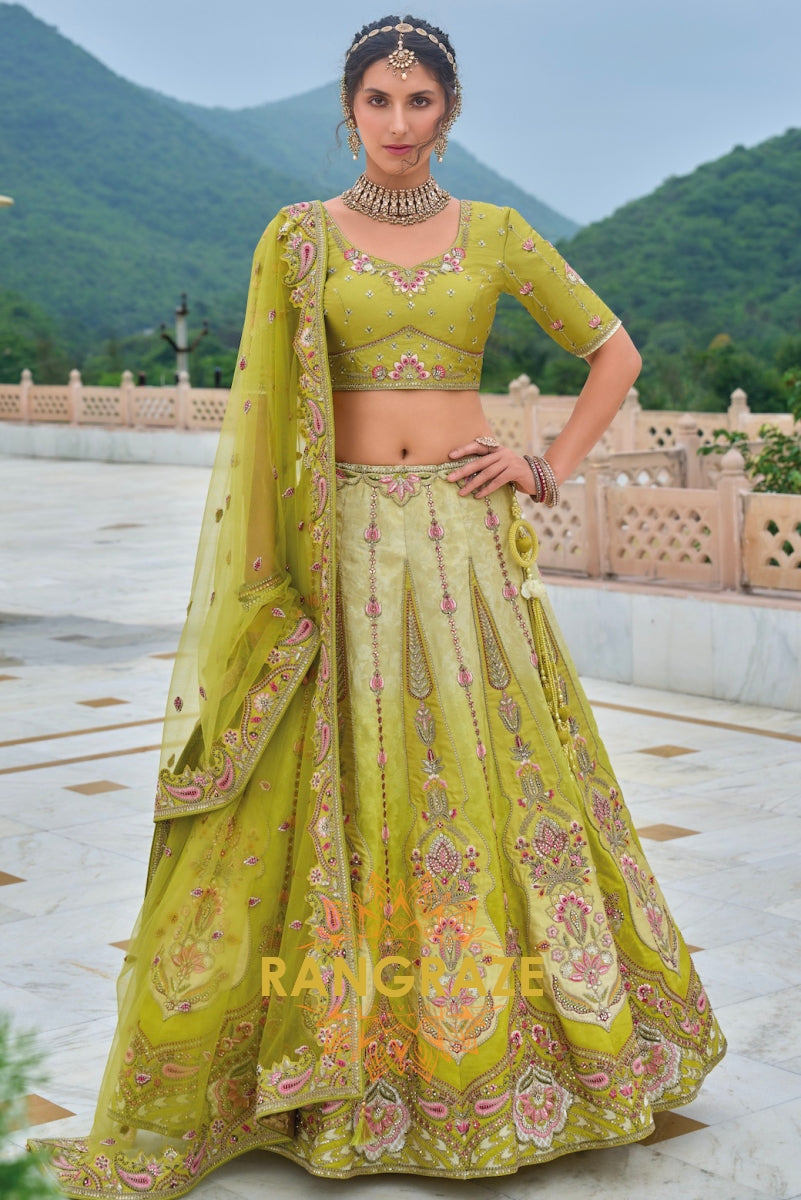 Unveil the charm of regality with this exquisite chartreuse green and pink embroidered lehenga, a...