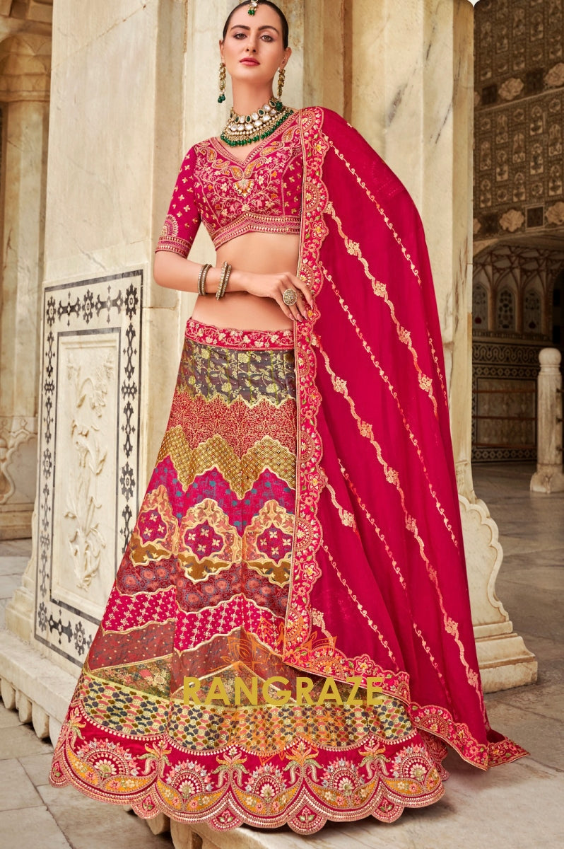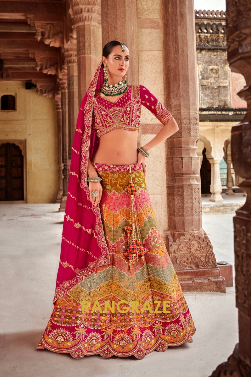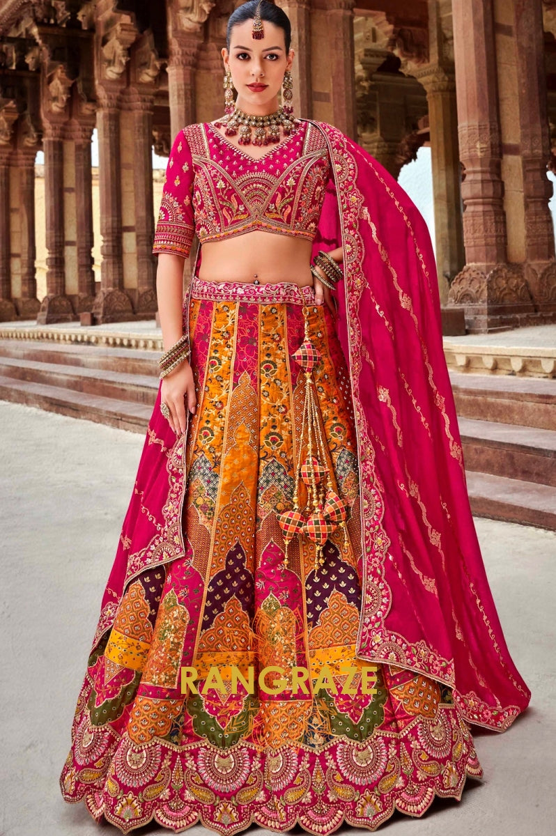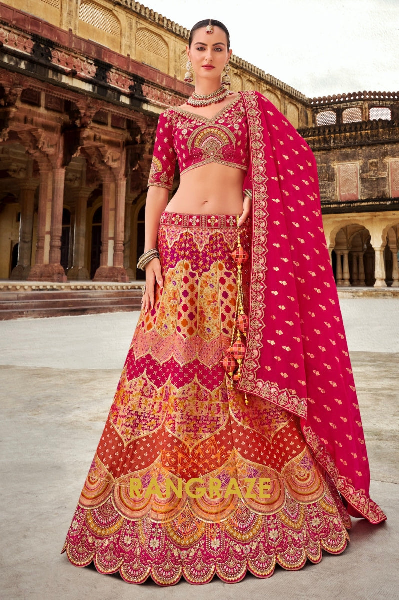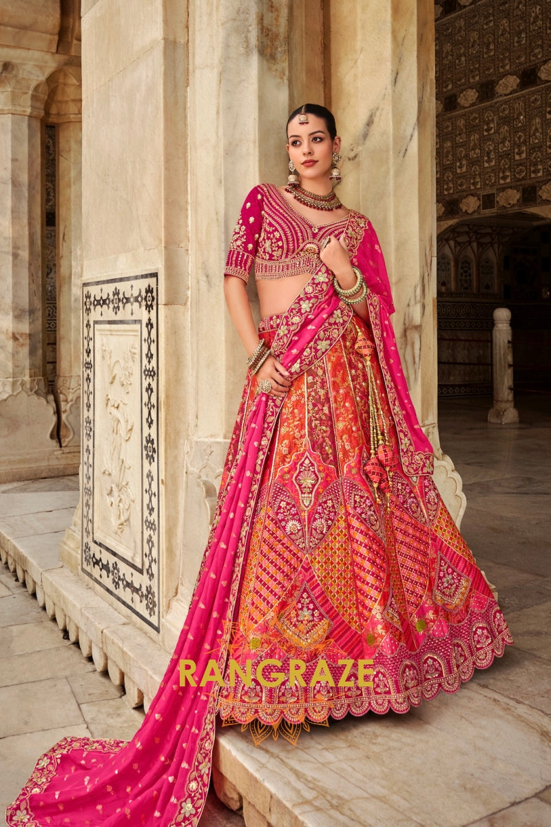 Radiant Fuchsia and Orange Embroidered Silk Lehenga – A Blend of Vibrance and Tradition