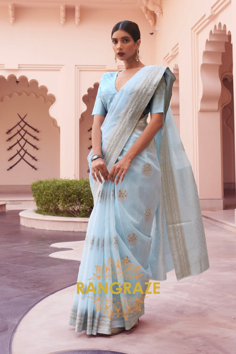 Sky Blue Woven Banarasi Linen Silk Saree